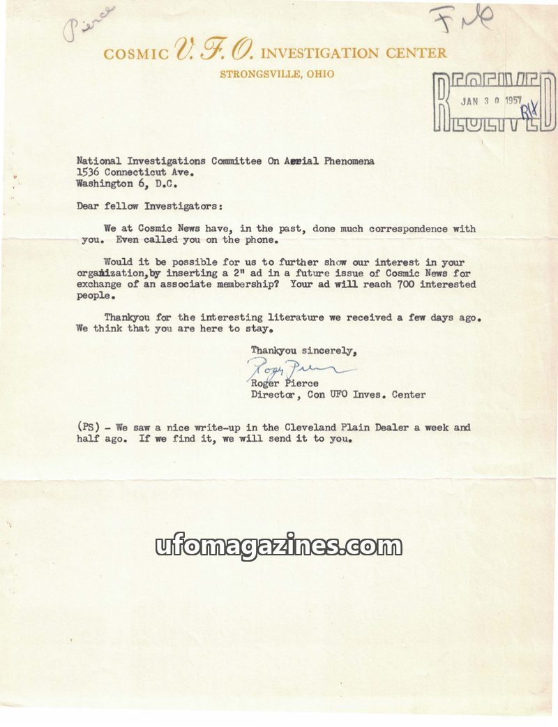 This document contains two pieces of correspondence related to 'Cosmic News'. The first, dated January 30, 1957, is from Roger Pierce of the Cosmic U.F.O. Investigation Center to t