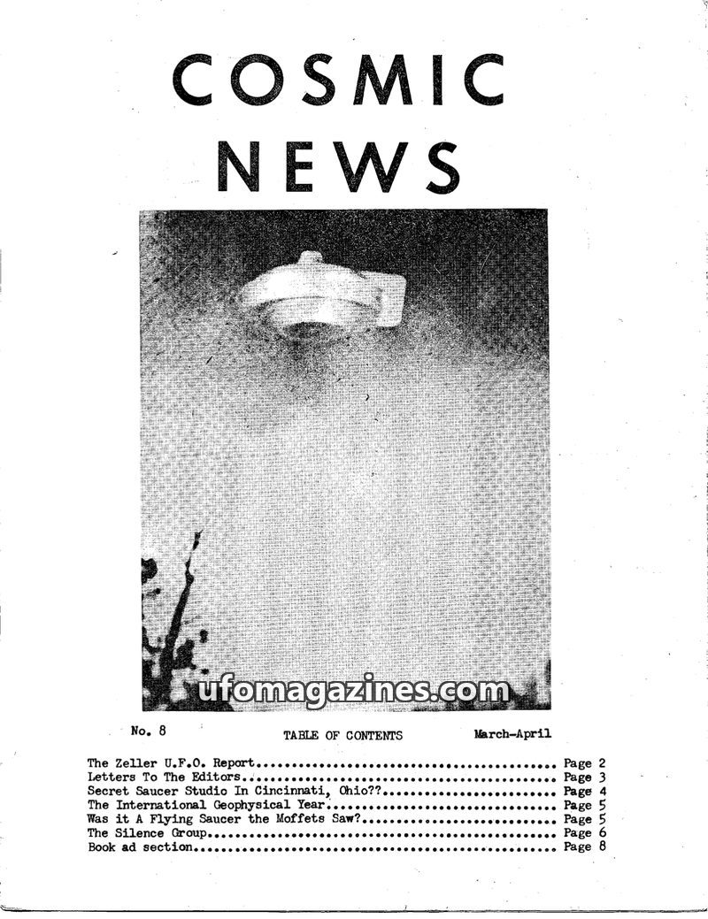 This issue of Cosmic News features the Zeller U.F.O. Report detailing a sighting of 20 objects in Cuyahoga Falls, Ohio, on September 30, 1956. It also includes a letter from Lonzo