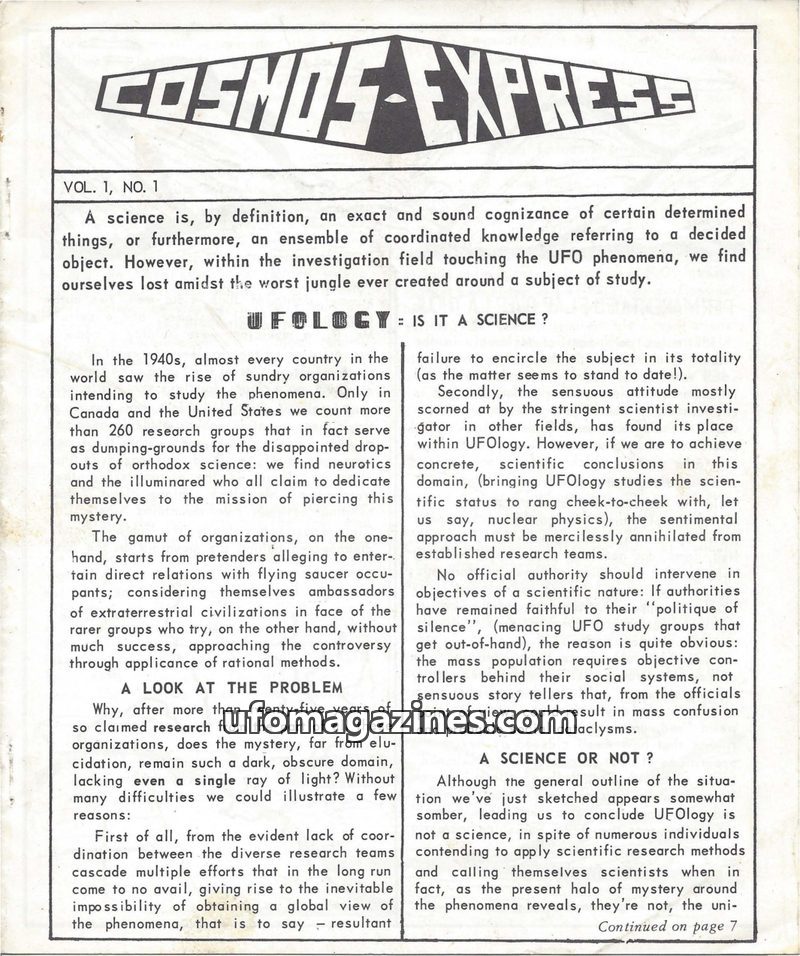 This issue of Cosmos Express questions whether ufology qualifies as a science, highlighting the lack of coordination and the sentimental approach often found in the field. It detai