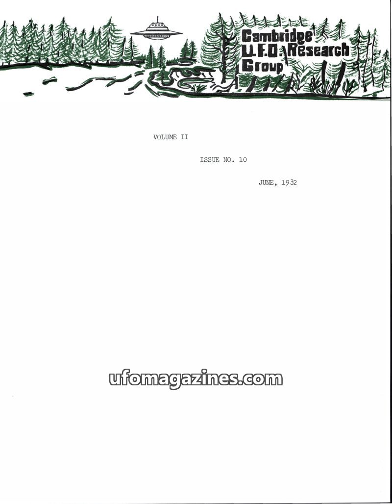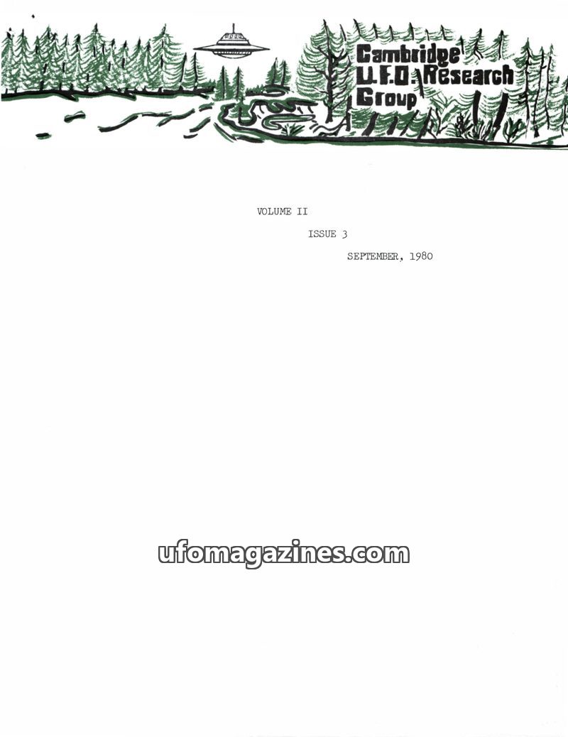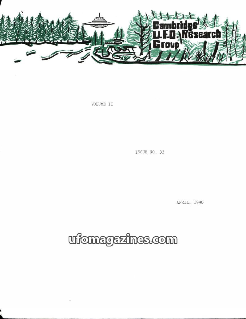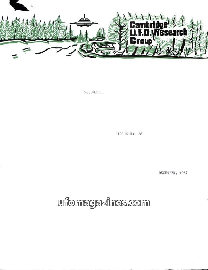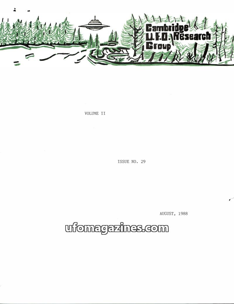 This issue of the Cambridge UFO Research Group Newsletter announces its final publication. It features articles on a puzzling crop circle in Malden Township, Canada, and a personal