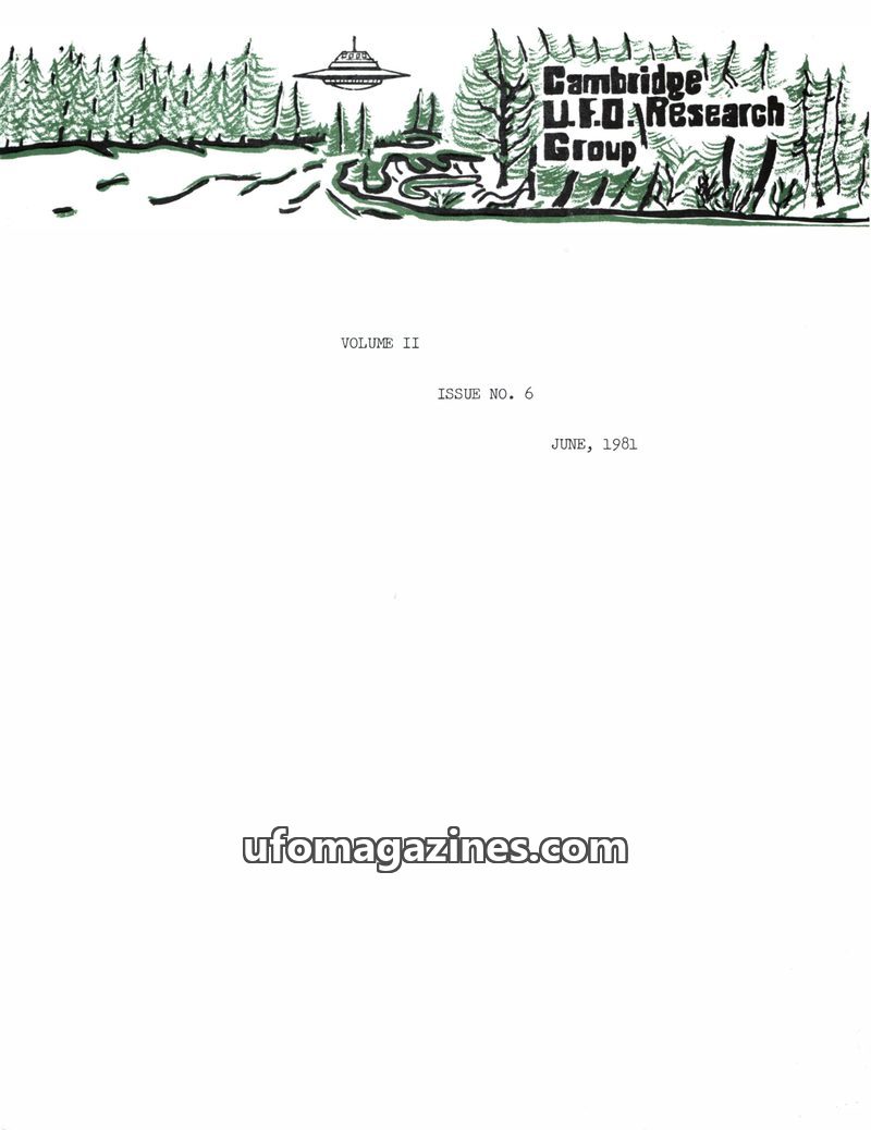 The June 1981 issue of the Cambridge UFO Research Group Newsletter covers recent meetings, including discussions on UFO conventions and David Haisell's involvement with UFOCAN. It