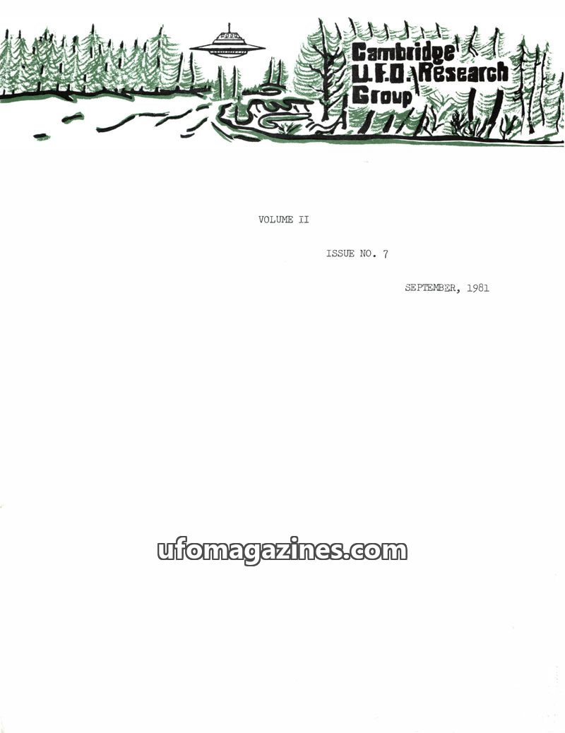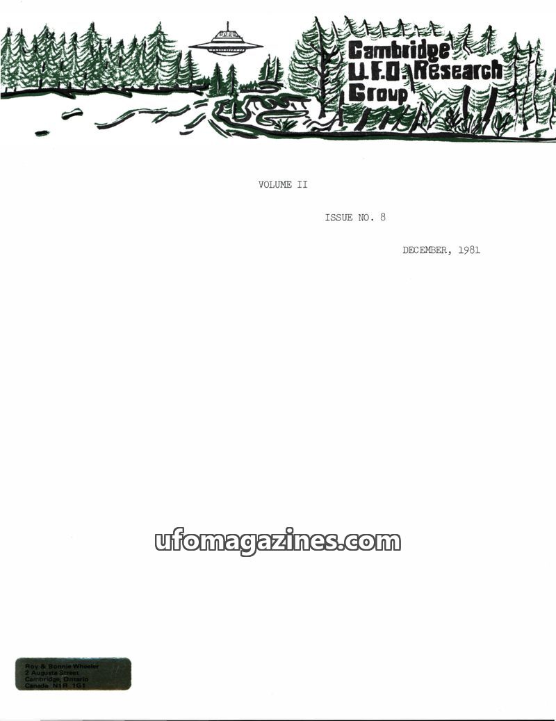 This issue of the Cambridge UFO Research Group Newsletter from September 1981 covers recent UFO sightings in Canada, including a cigar-shaped object in Waterloo and two meteor-like