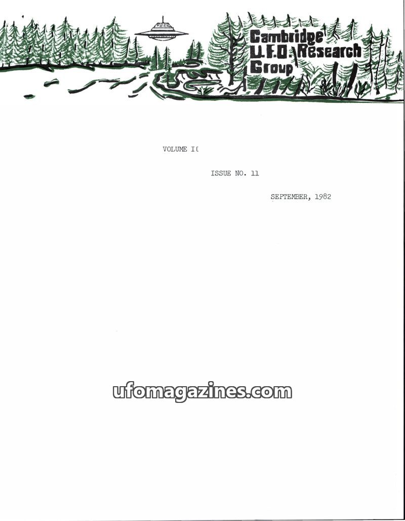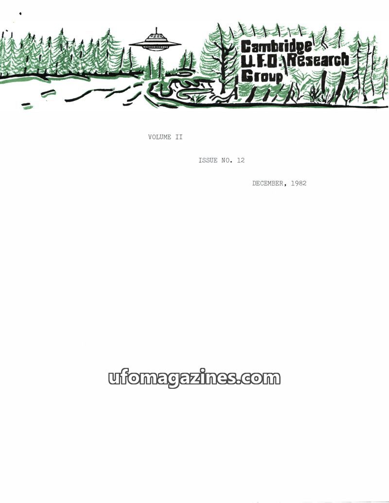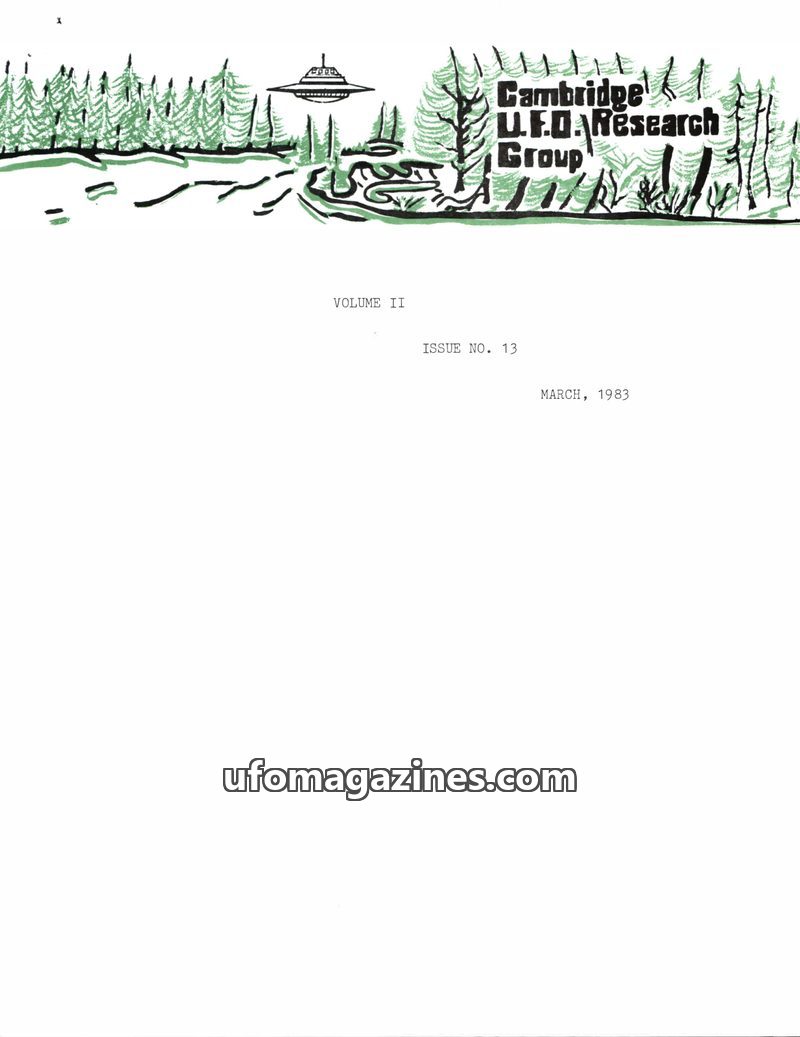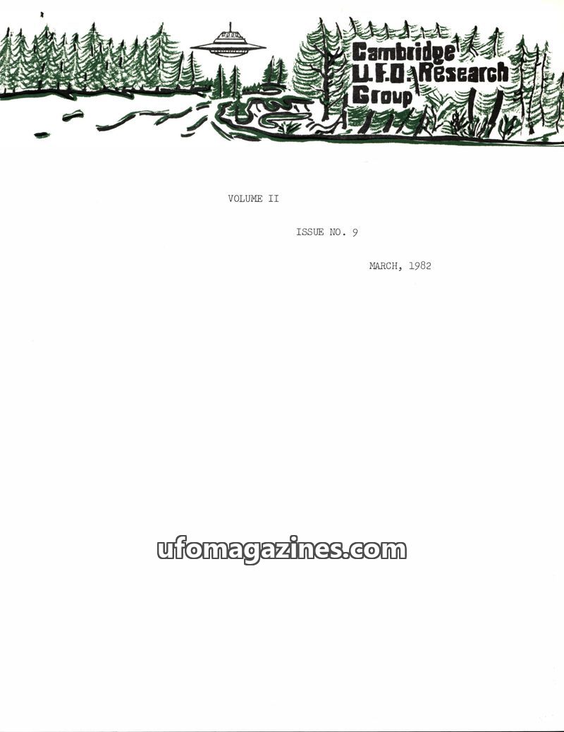 This issue of the Cambridge UFO Research Group Newsletter from March 1982 covers several UFO-related incidents and events. It details a potential murder case linked to a UFO in Bra