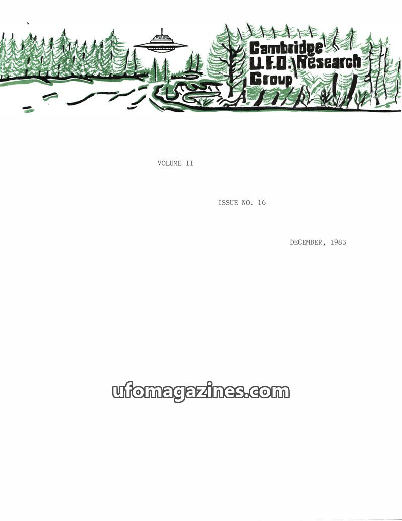 This issue of the Cambridge UFO Research Group Newsletter from December 1983 covers recent meetings, including a presentation by Oscar Magocsi about his UFO contact experiences and