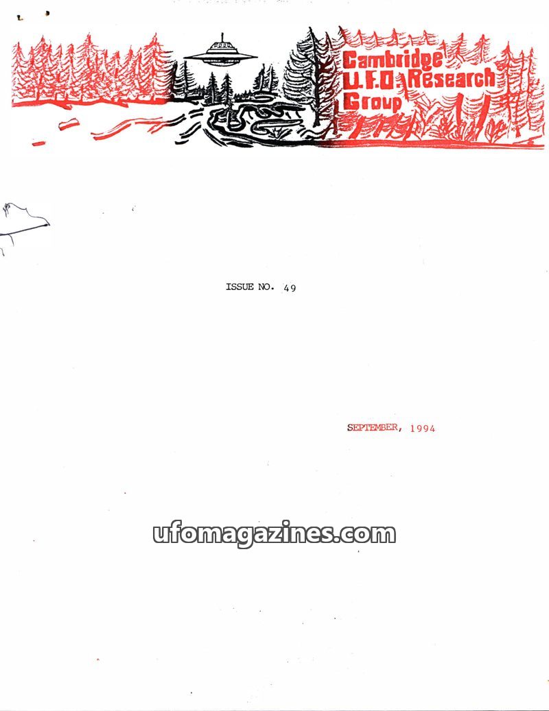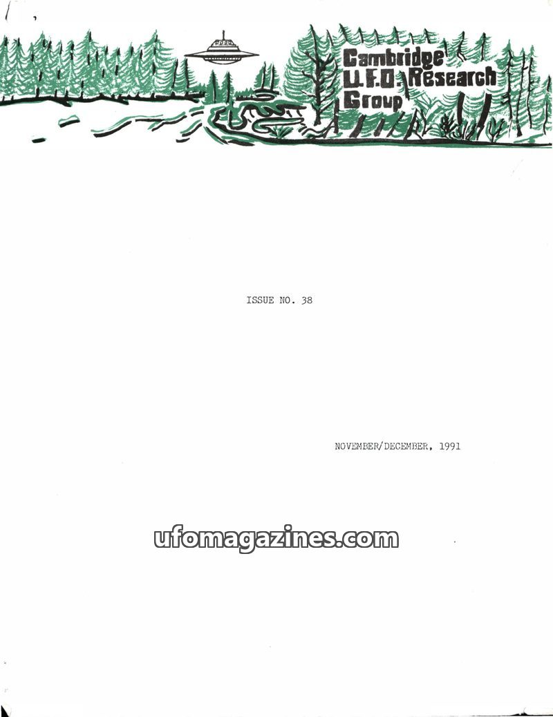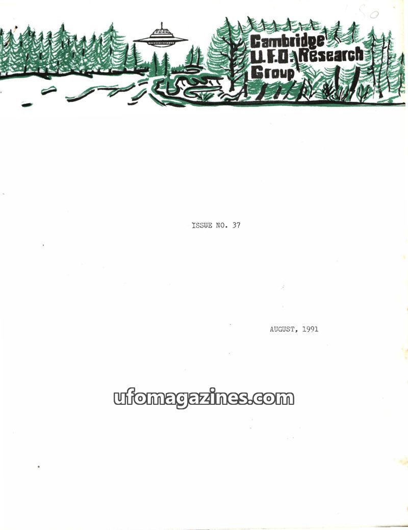 This issue of the Cambridge UFO Research Group Newsletter (Issue 37, August 1991) details ongoing investigations into UFO sightings and contactee experiences. It includes an interv