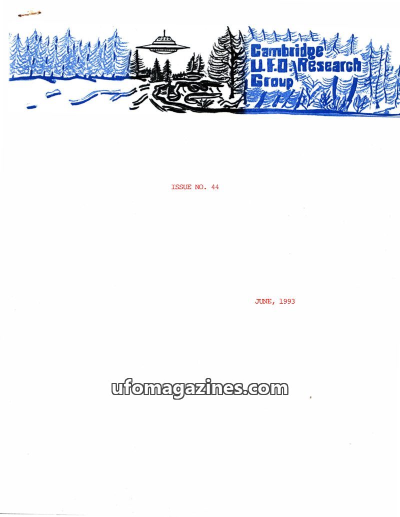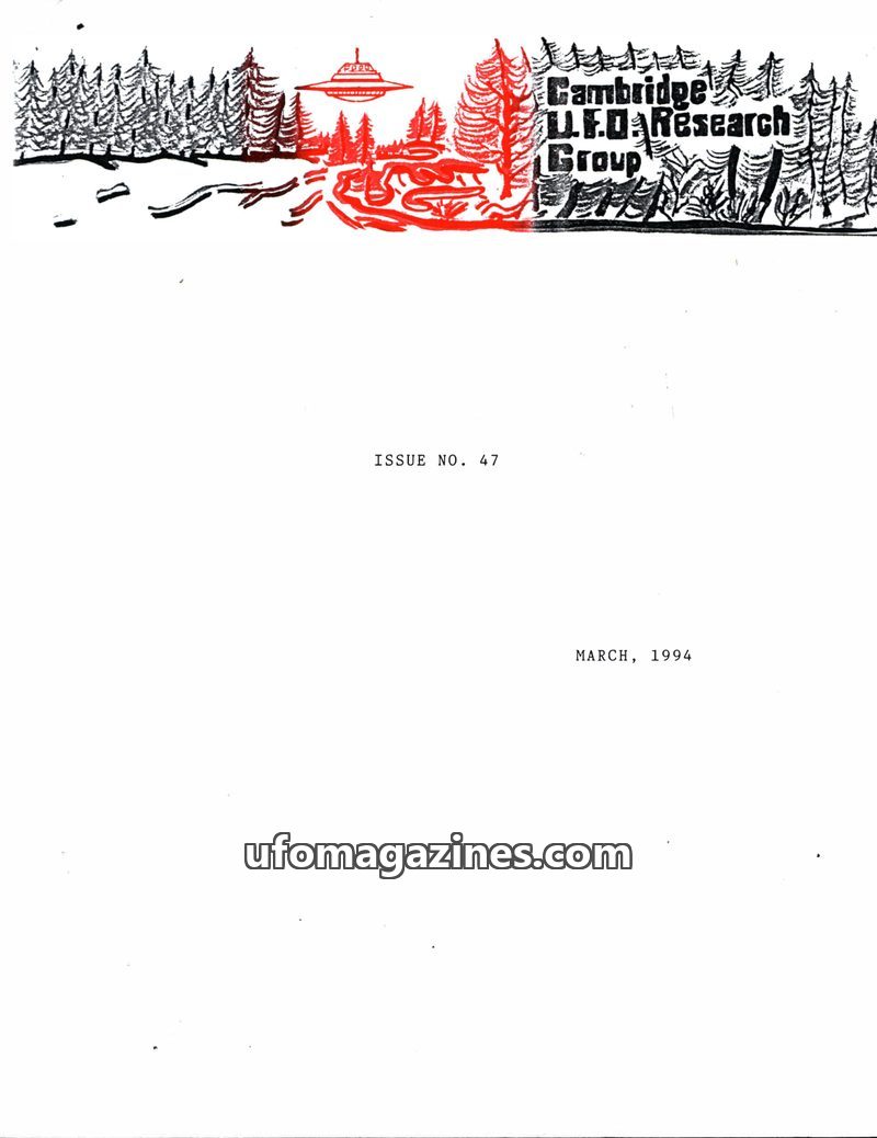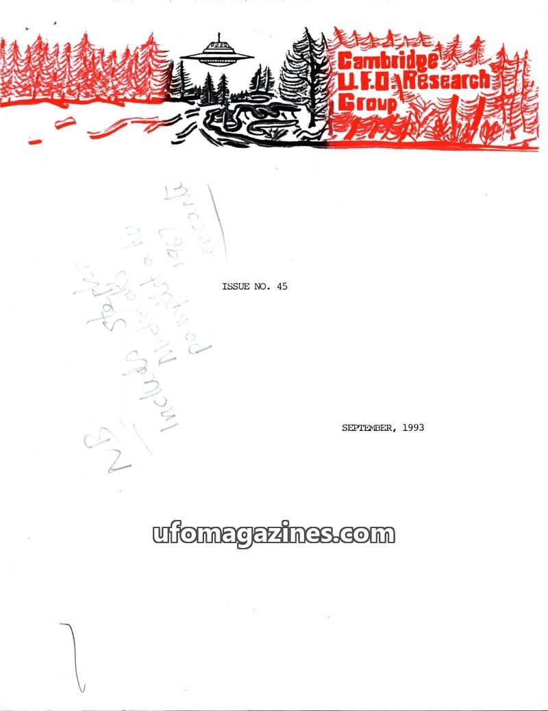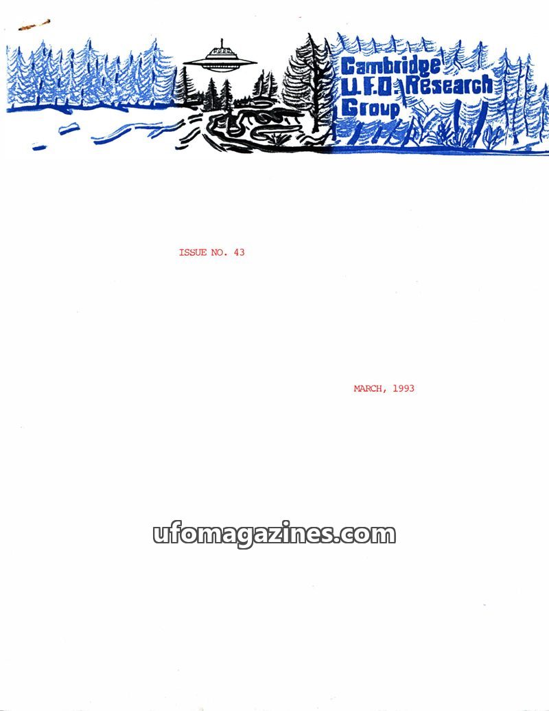 This issue of the Cambridge UFO Research Group Newsletter from March 1993 covers a range of topics including UFO sightings in South America and Europe, potential connections betwee