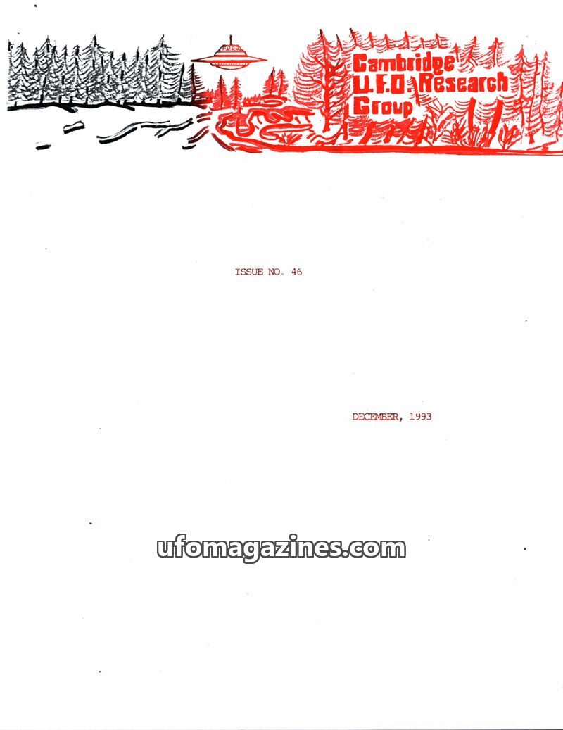 This issue of the Cambridge UFO Research Group Newsletter, dated December 1993, covers recent UFO sightings, including pulsating lights observed by members Joe Madruga and Dag Balz