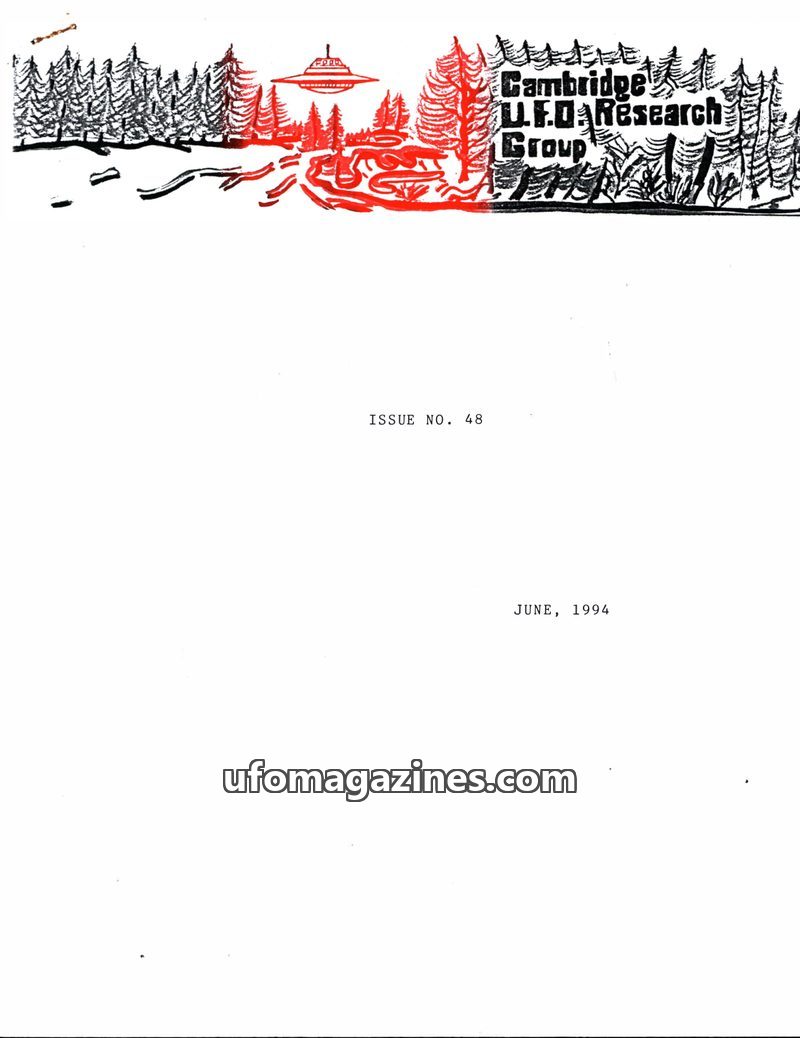 This issue of the Cambridge UFO Research Group Newsletter (Issue 48, June 1994) details the group's March meeting, which involved attending a UFO Symposium in Bradford. The May mee