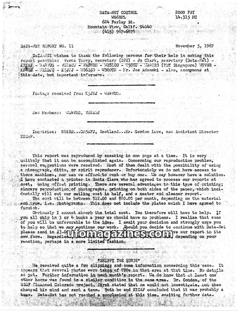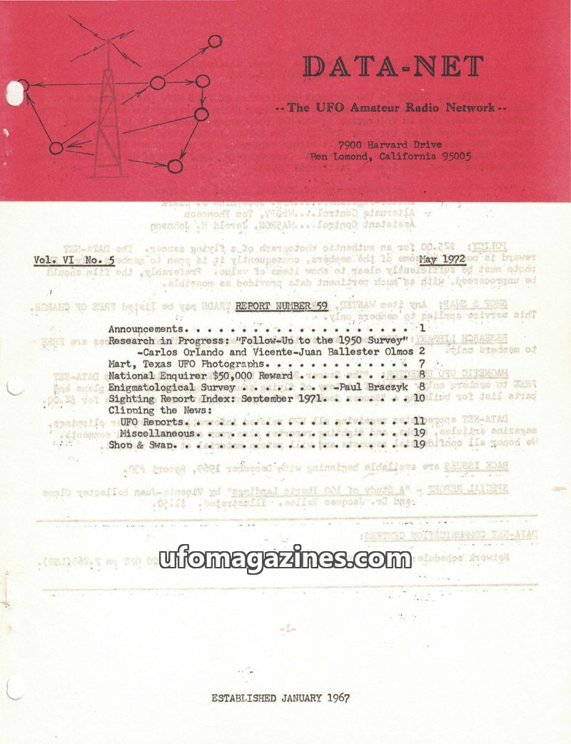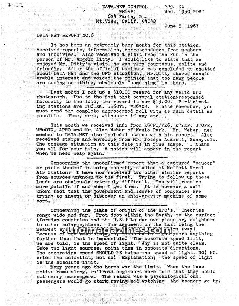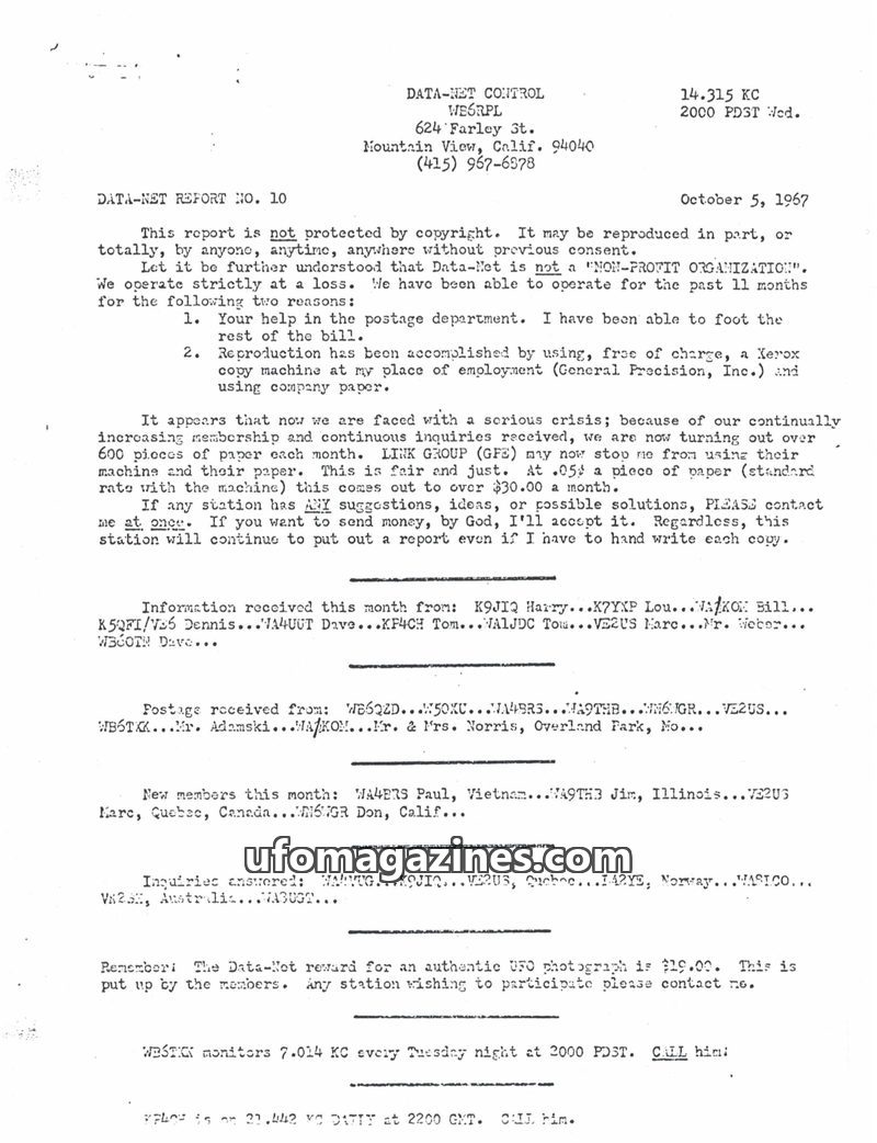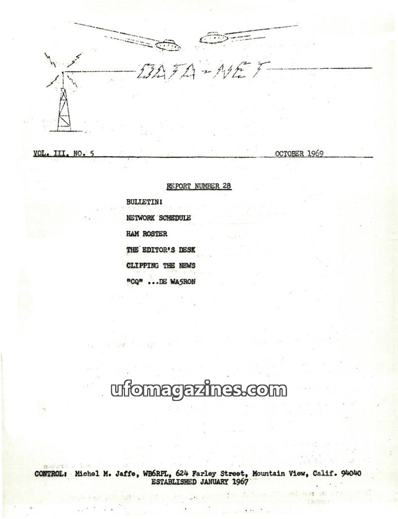 This issue of DATA-NET REPORT details a busy month for the control station, including a visit from the FCC and increased UFO reports. A reward for UFO photographs was increased due