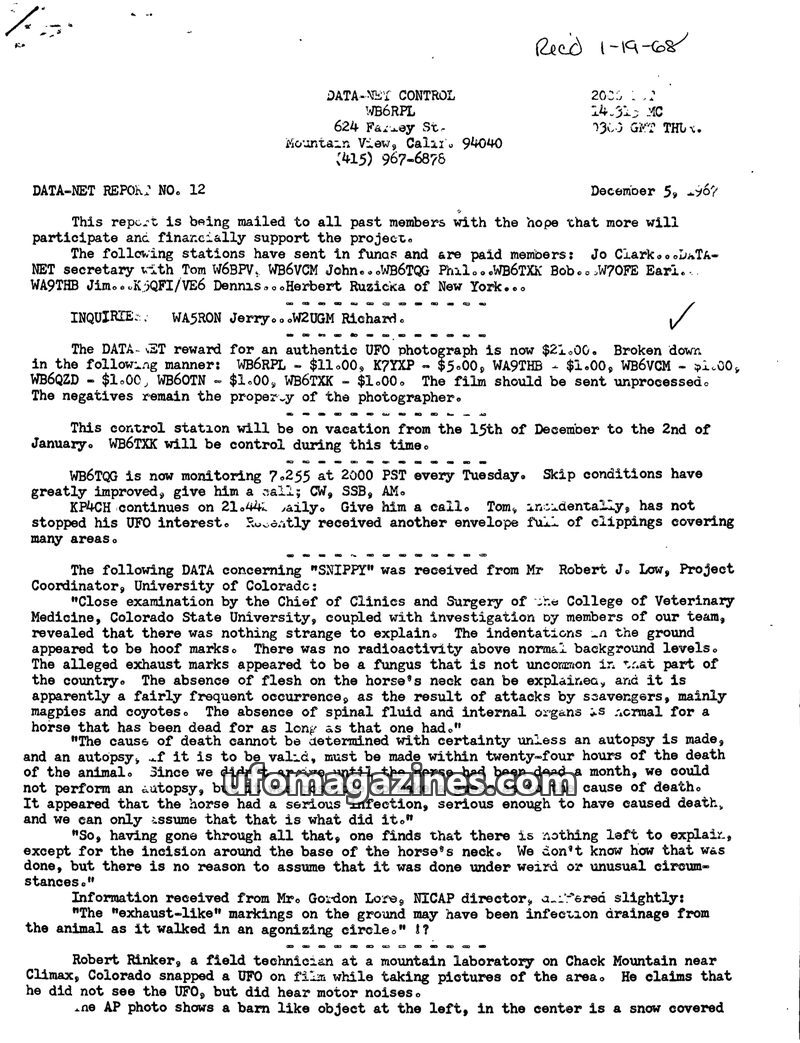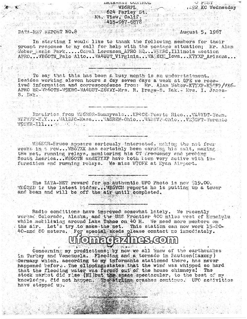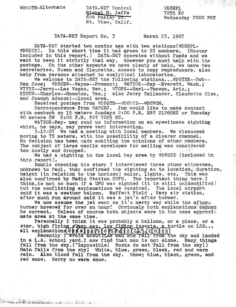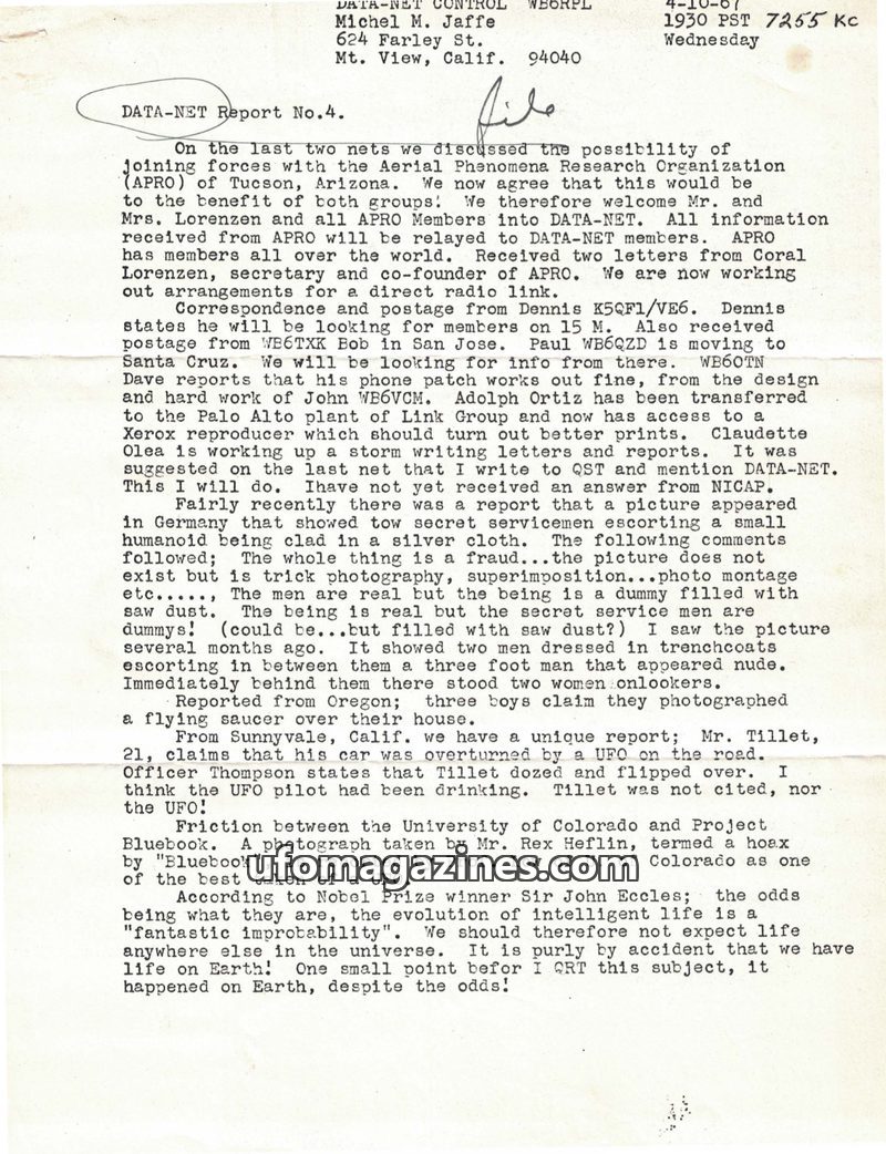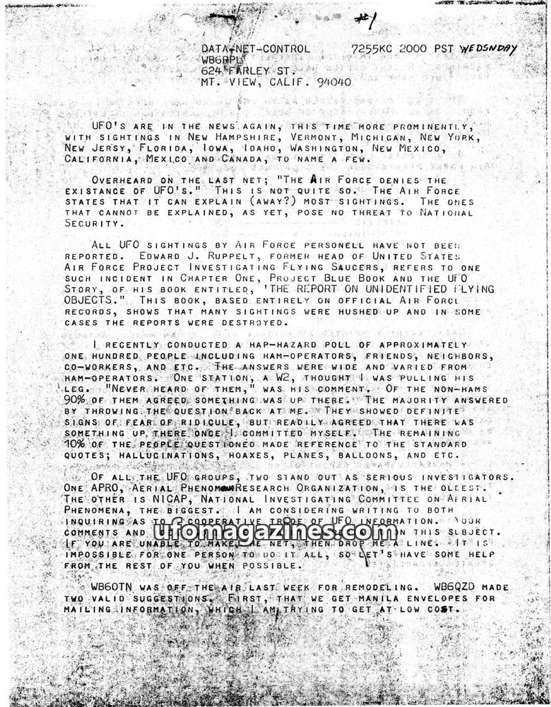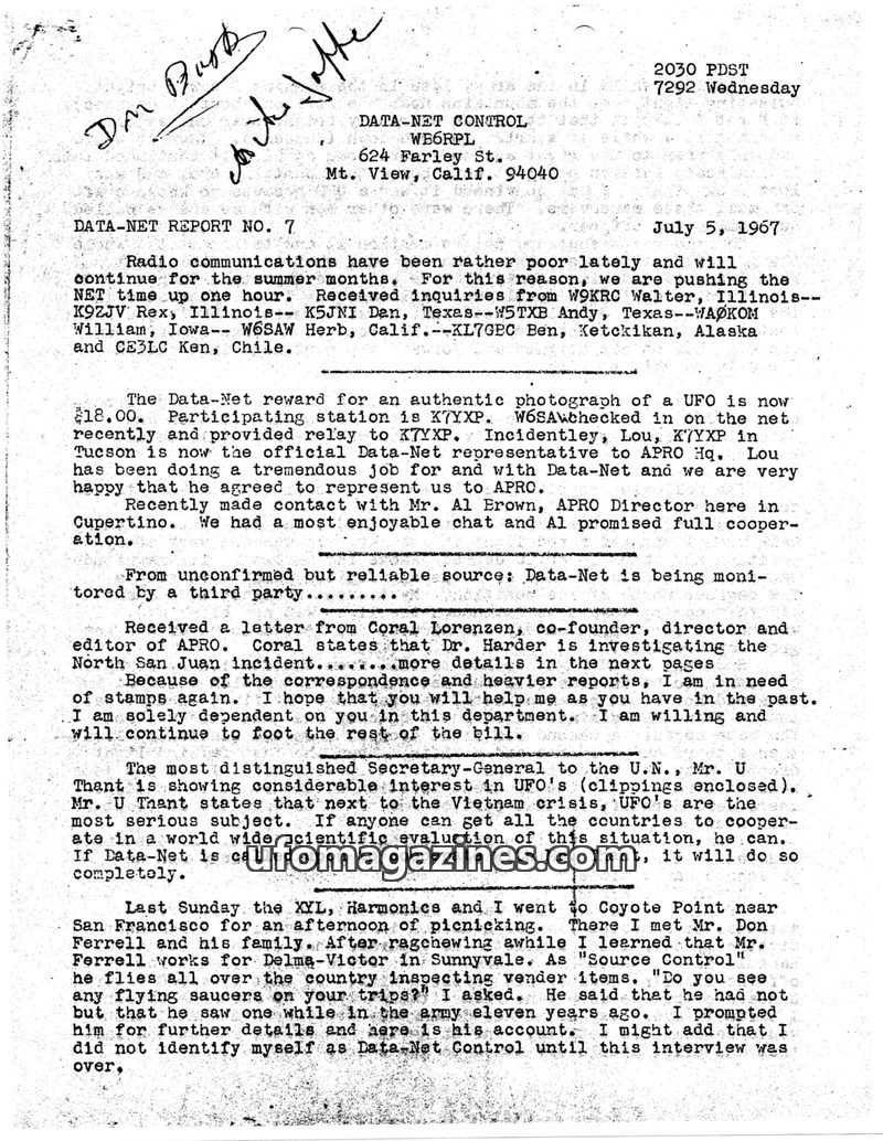 This issue of DATA-NET REPORT details a busy month for the control station, including a visit from the FCC and increased UFO reports. A reward for UFO photographs was increased due