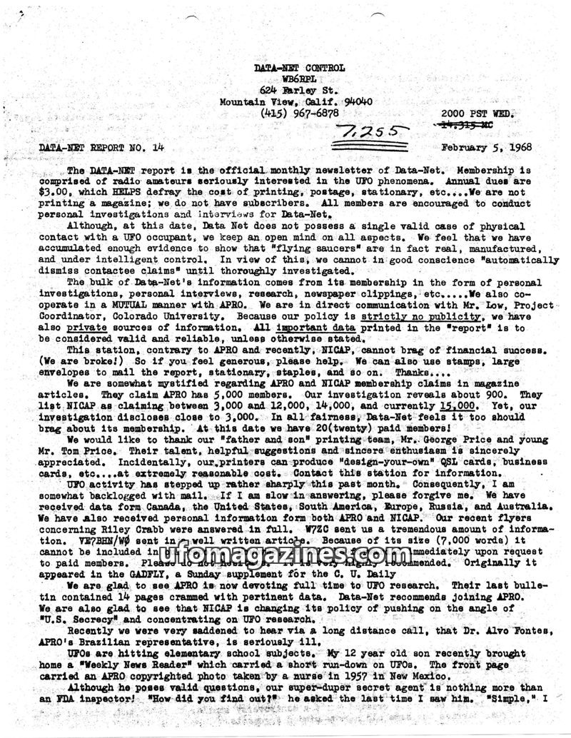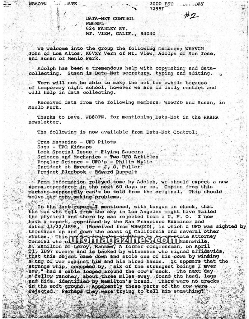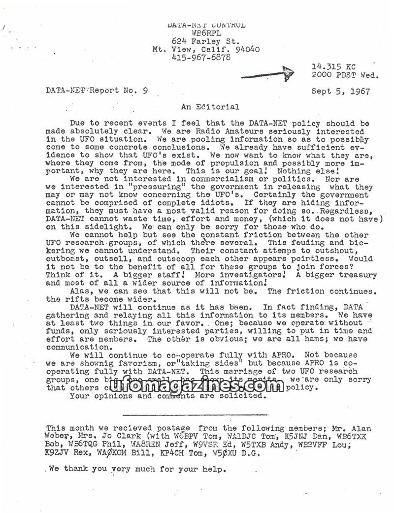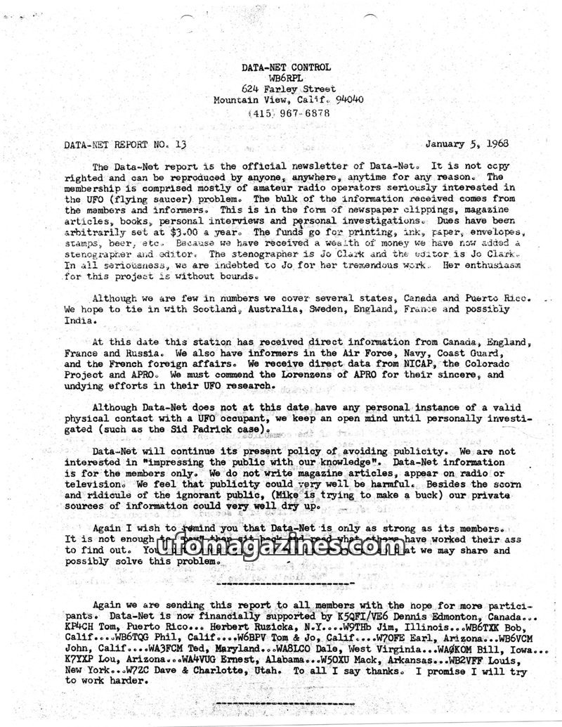 This issue of Data-Net Report details the organization's membership, primarily amateur radio operators interested in UFOs, and its methods of information gathering. It highlights i