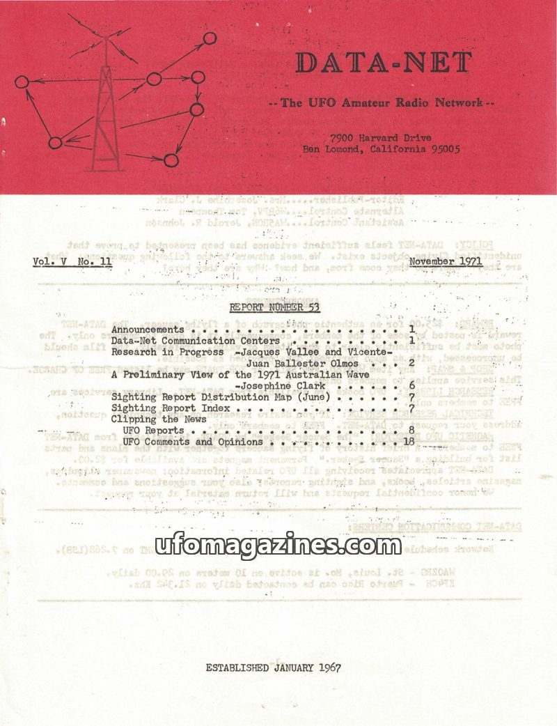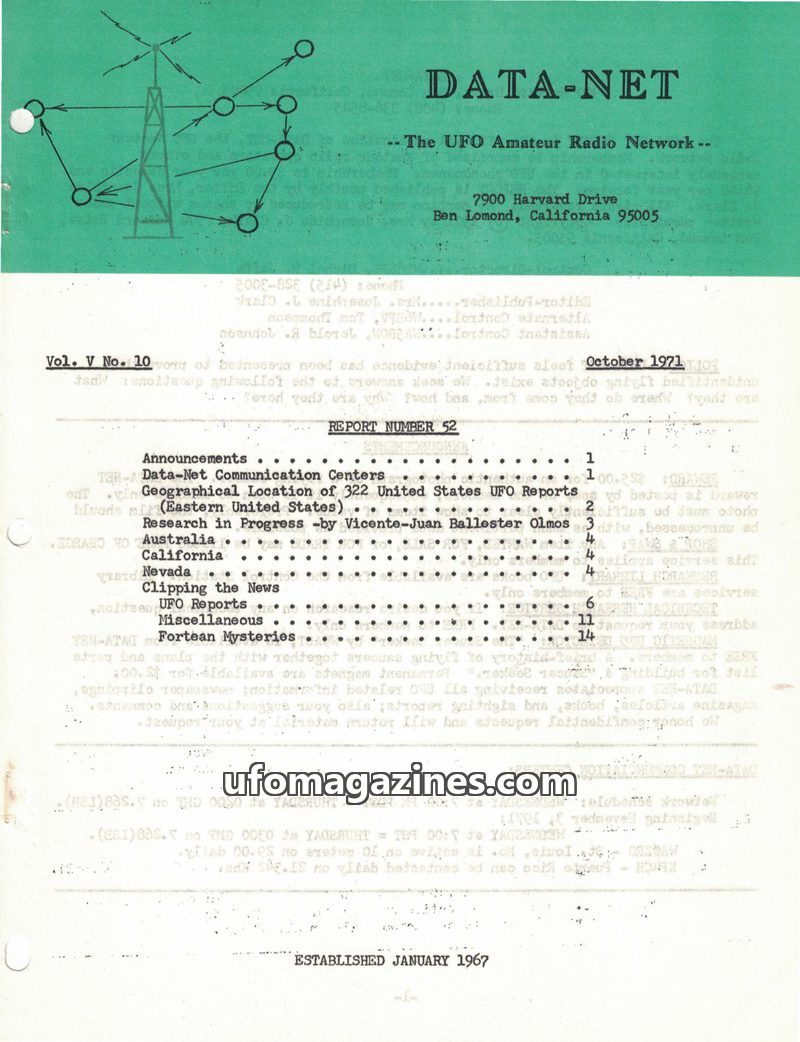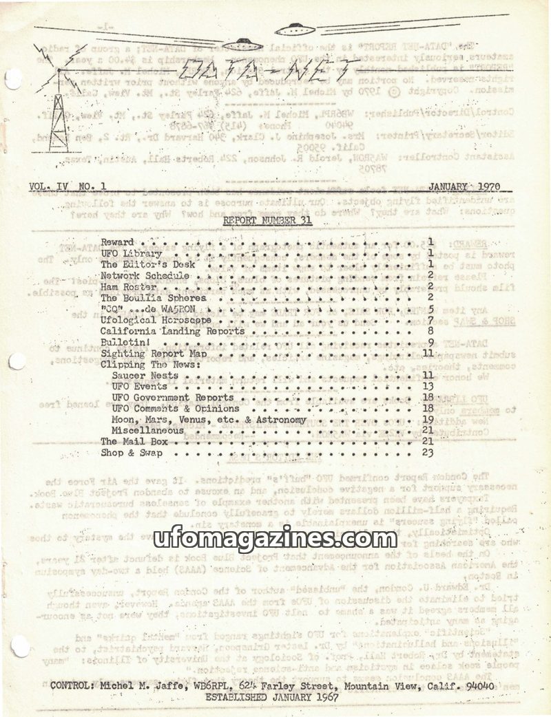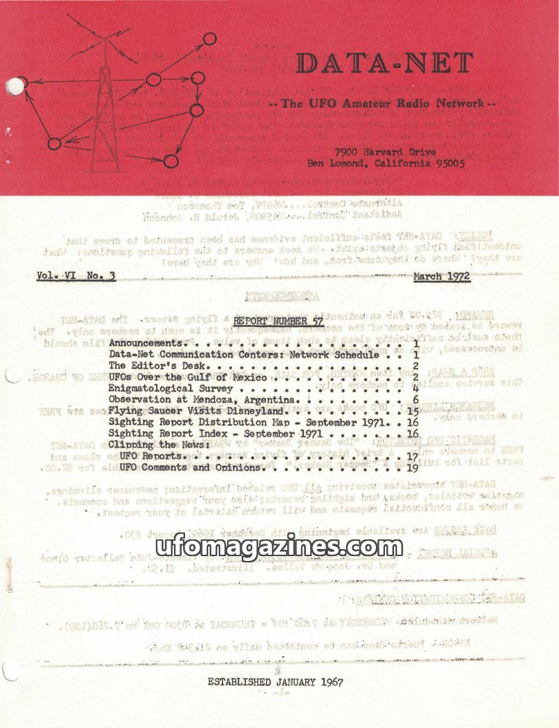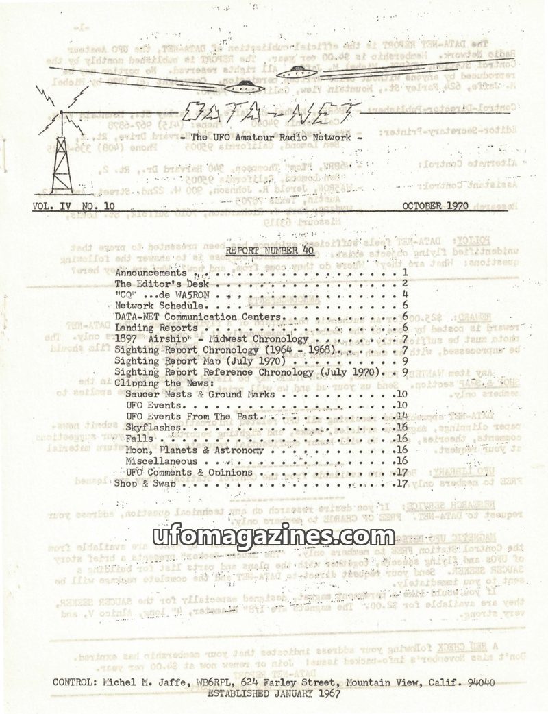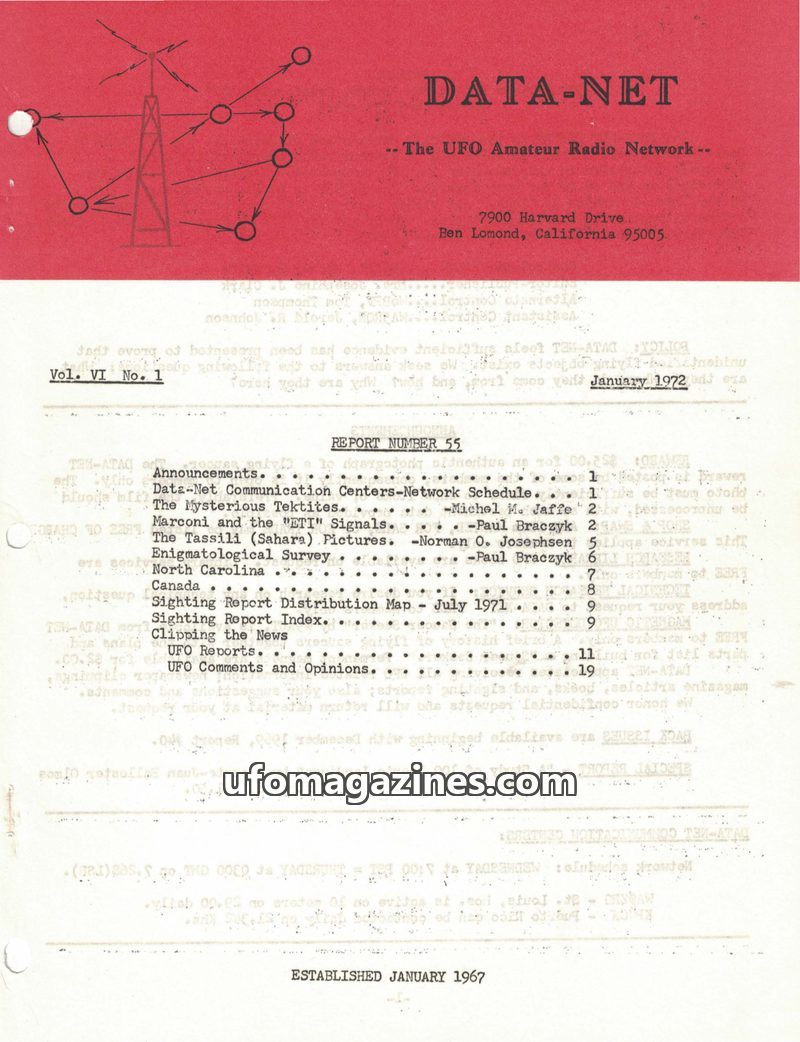 This issue of DATA-NET, the UFO Amateur Radio Network's publication, covers a range of UFO-related topics. It includes an article on mysterious tektites and Dr. Virgil Barnes's the