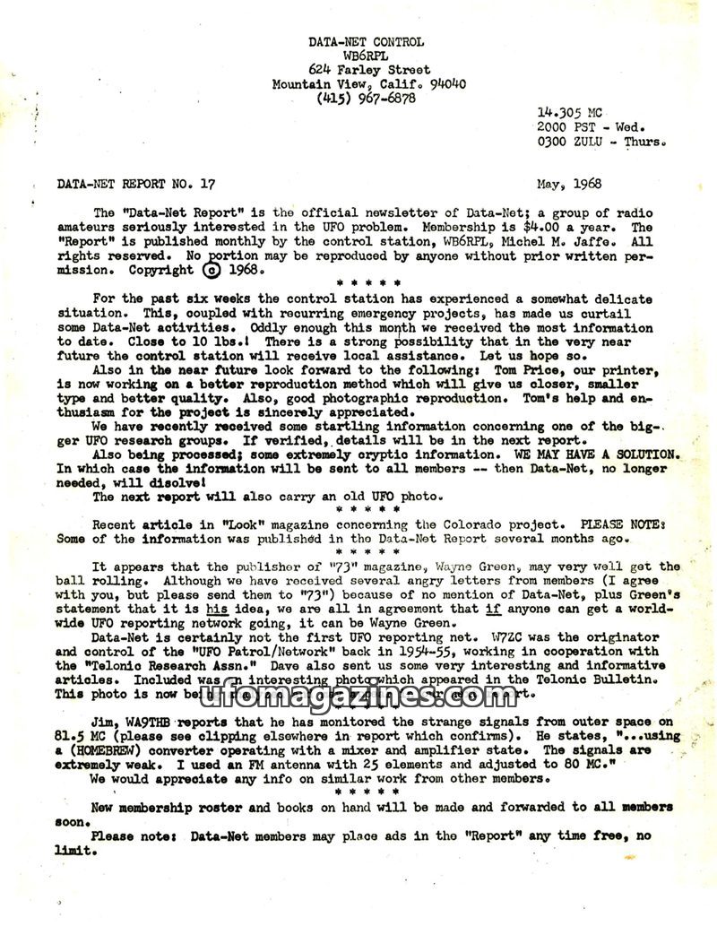 The May 1968 Data-Net Report details ongoing UFO investigations, including information from the 'Look' magazine article on the Colorado project and Wayne Green's efforts to establi