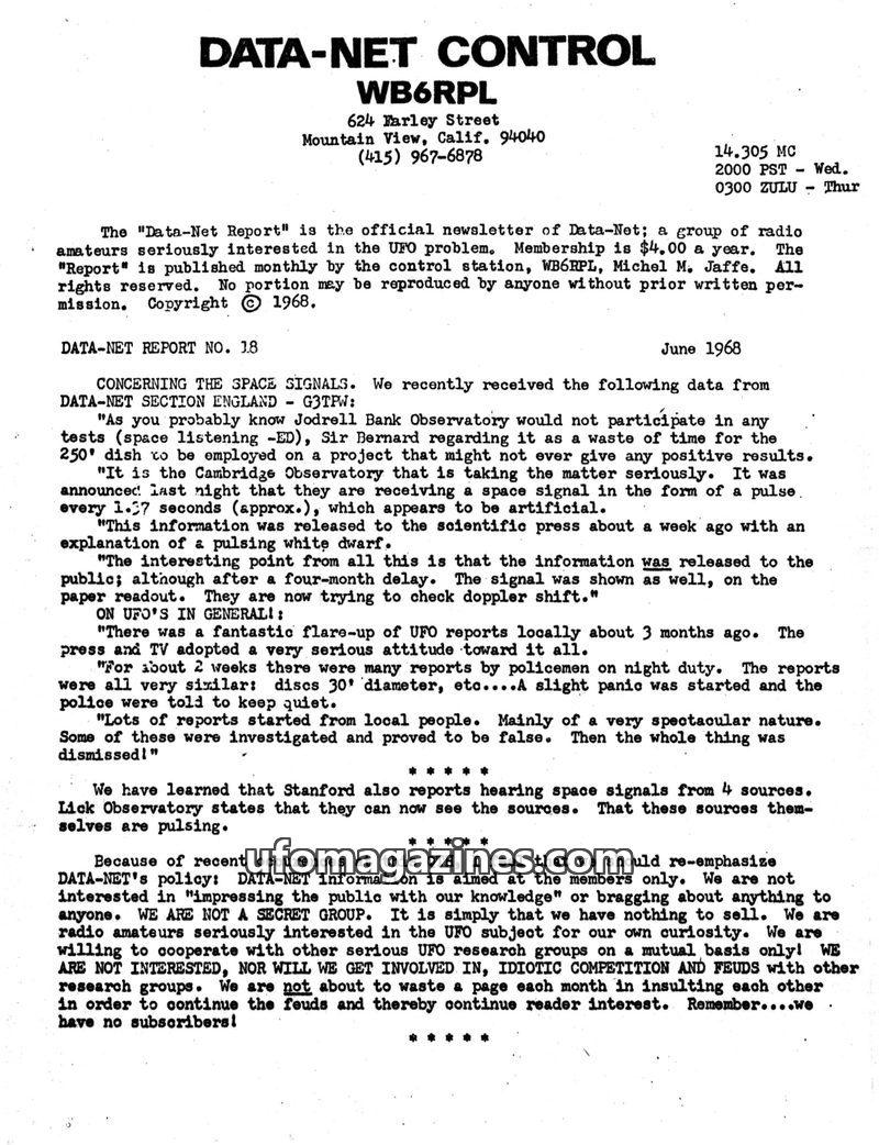 DATA-NET, a group of Radio Amateurs, aims to reach concrete conclusions about UFOs, focusing on their nature, origin, and propulsion, rather than commercialism or politics. They em