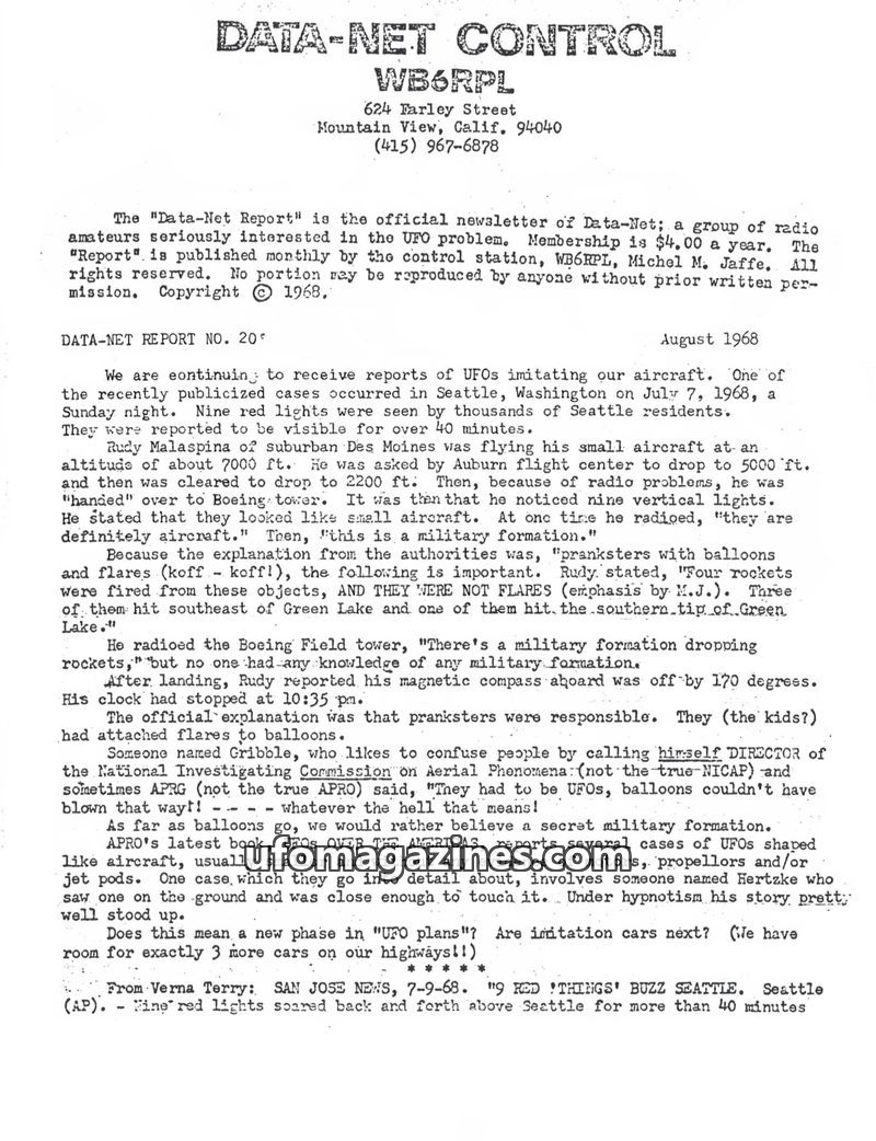 This issue of Data-Net Control (August 1968) details a significant UFO sighting in Seattle on July 7, 1968, involving nine red lights observed by thousands and a pilot who reported