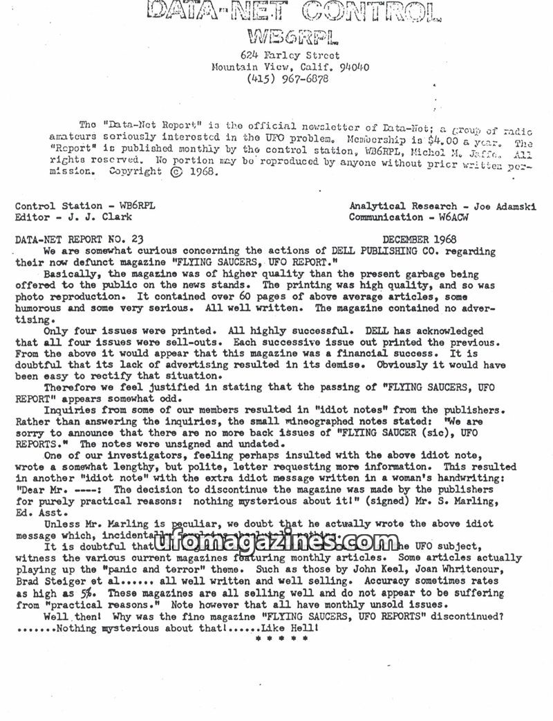 This issue of DATA-NET CONTROL WBGRPL discusses the mysterious discontinuation of Dell Publishing's 'Flying Saucers, UFO Report' magazine, questioning the publisher's stated reason