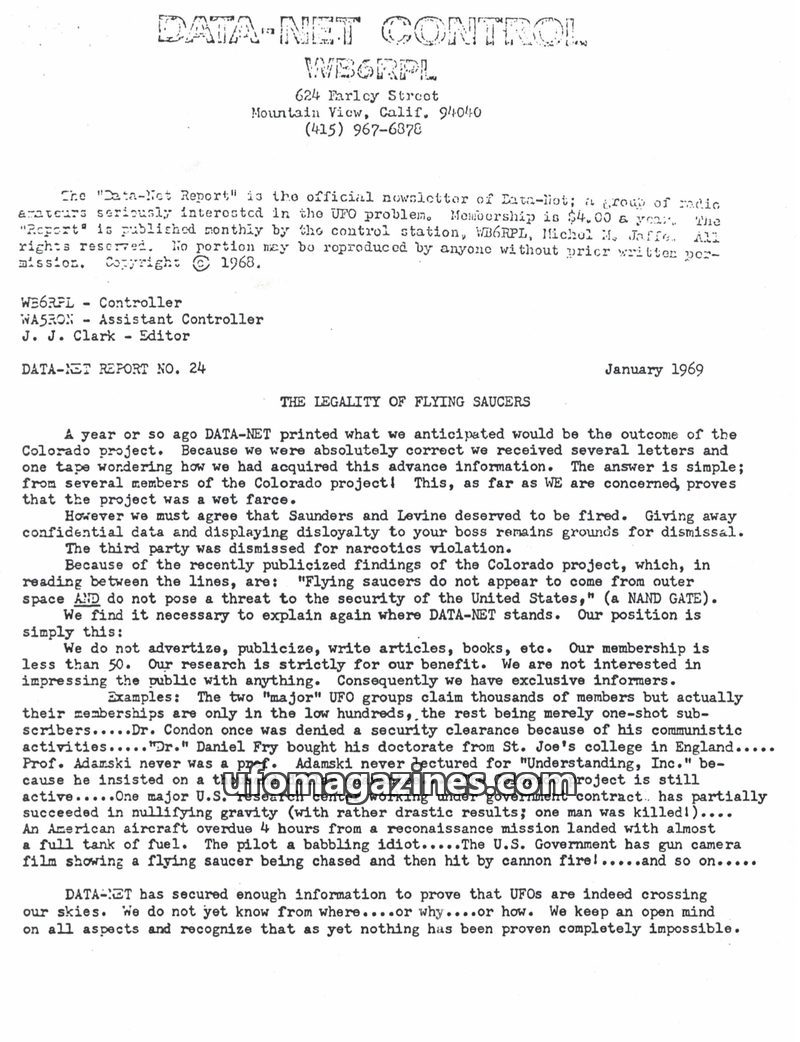 This issue of DATA-NET CONTROL (Jan 1969) focuses on the 'Legality of Flying Saucers' and critiques the Condon Committee report, calling it a 'wet farce' and 'bad advice'. The news