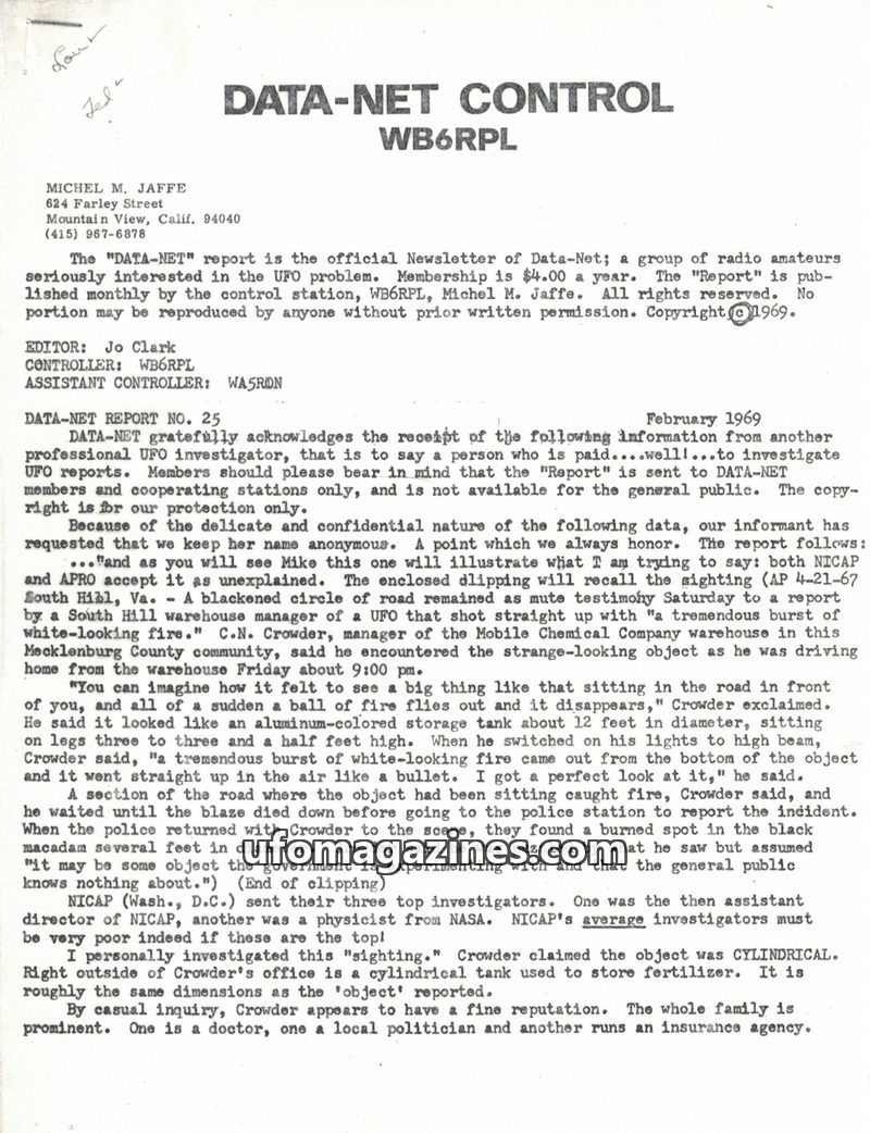 This issue of DATA-NET CONTROL (February 1969) presents a detailed report on a UFO sighting in South Hill, Virginia, including an analysis of charred paper matches as potential evi