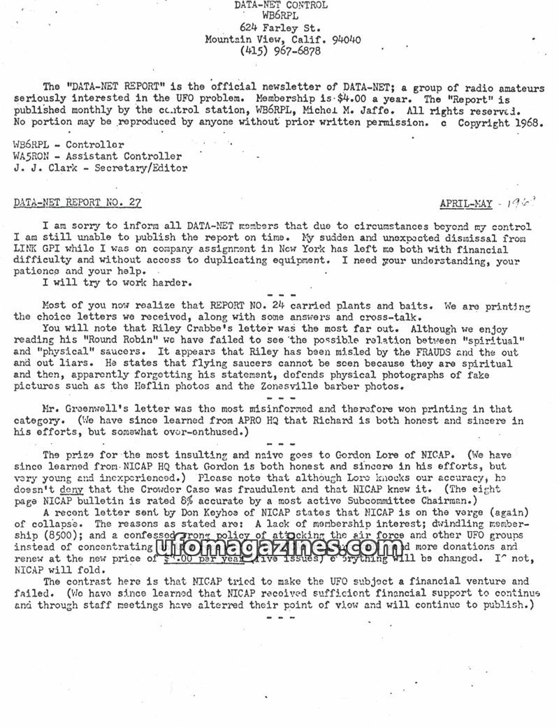 This issue of DATA-NET REPORT addresses delays in publication due to the editor's dismissal and financial difficulties. It critiques various UFO organizations, including NICAP and