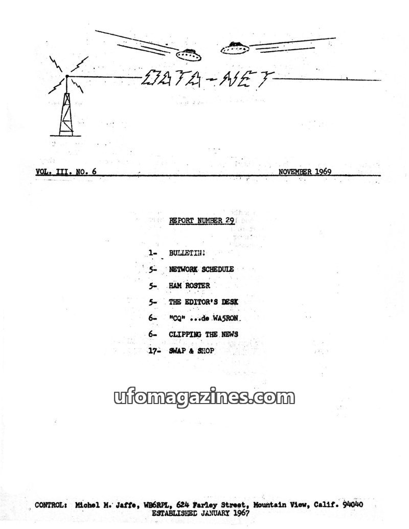 This issue of the DATA-NET REPORT, dated November 1969, is the official newsletter for a group of radio amateurs interested in UFOs. It includes a bulletin with network schedules a