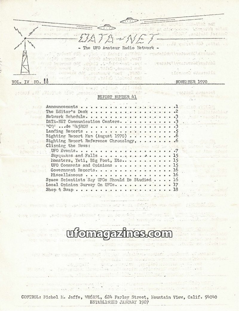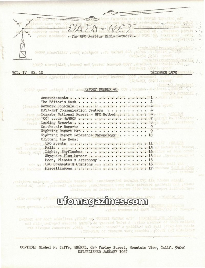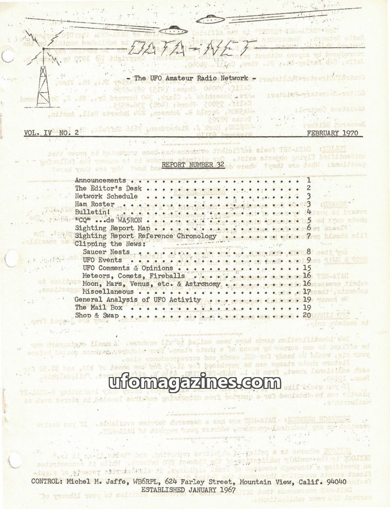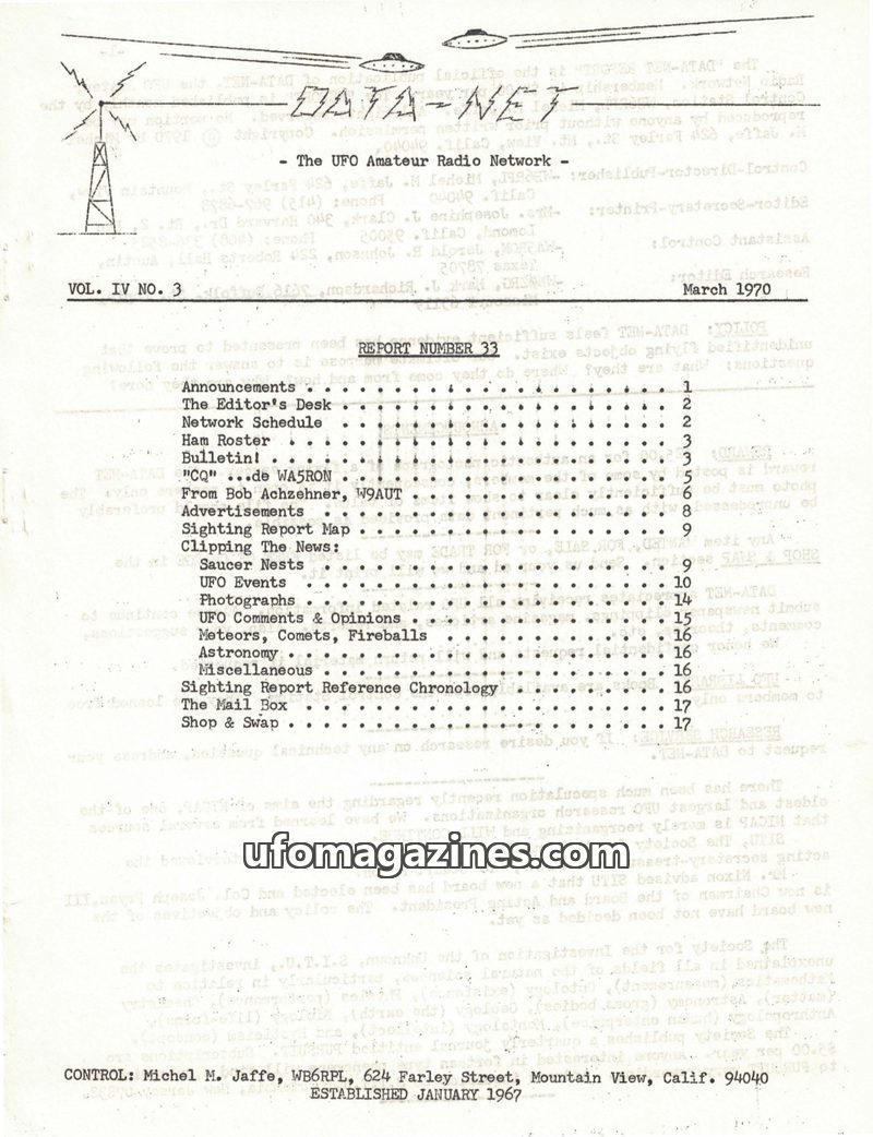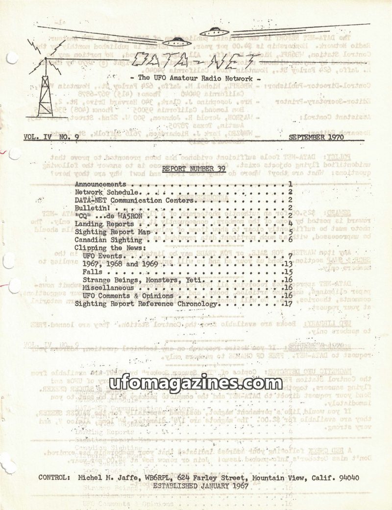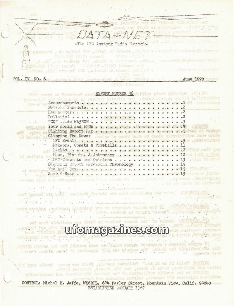 This issue of DATA-NET, published in June 1970, focuses on UFO sightings and related research. It includes a detailed table of contents covering announcements, network schedules, a