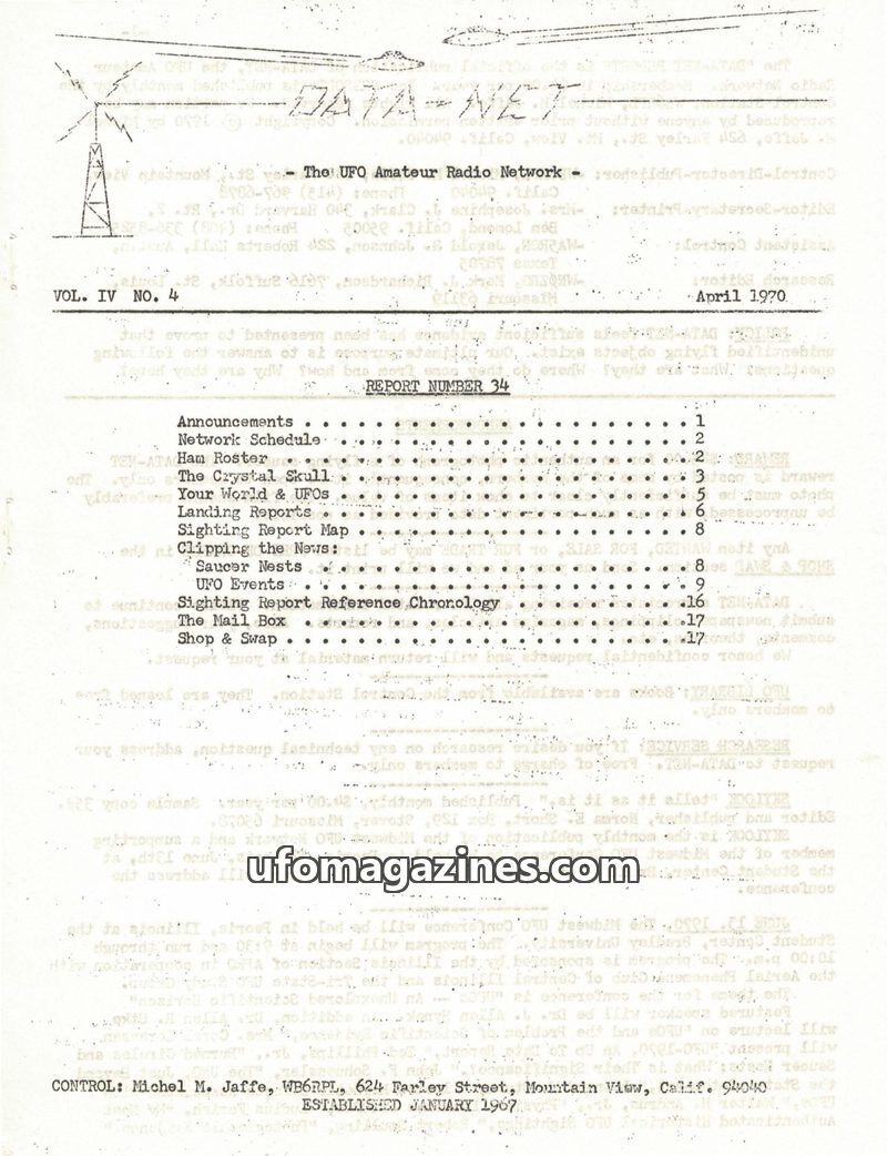 This issue of DATA-NET, dated April 1970, focuses on the UFO Amateur Radio Network's activities and reports. A significant feature is the detailed account of the Mitchell-Hedges cr