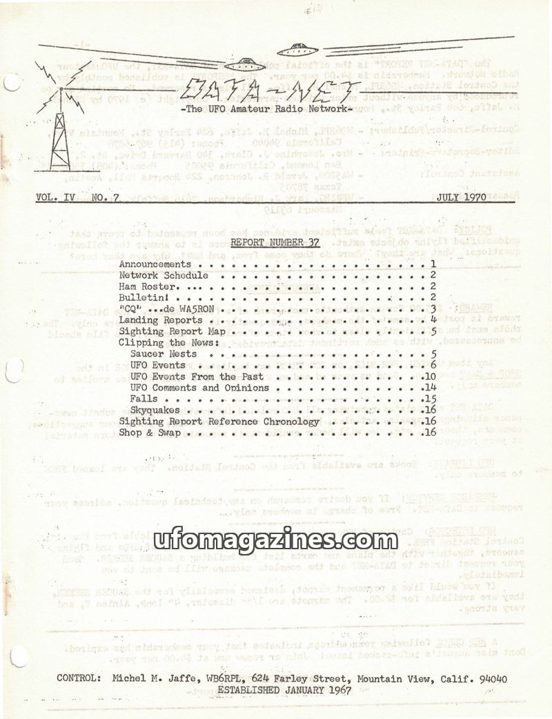 This issue of DATA-NET, the UFO Amateur Radio Network's publication, features Report Number 37 from July 1970. It includes announcements, network schedules, a ham roster, and vario