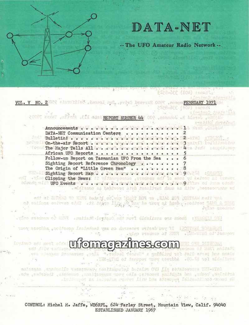 This issue of DATA-NET, published by the UFO Amateur Radio Network in February 1971, details various UFO sightings from around the world, including reports from Africa, Australia,