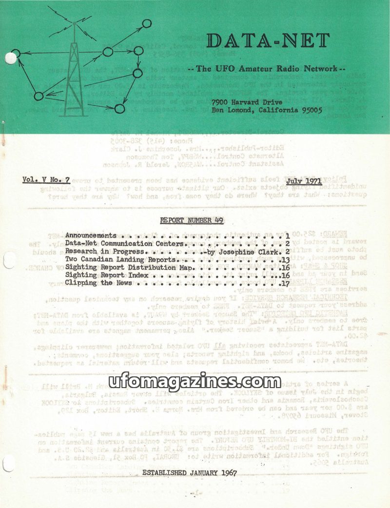 This issue of Data-Net Control, a newsletter for radio amateurs interested in UFOs, covers various topics including new members, international cooperation in UFO research, and a $2