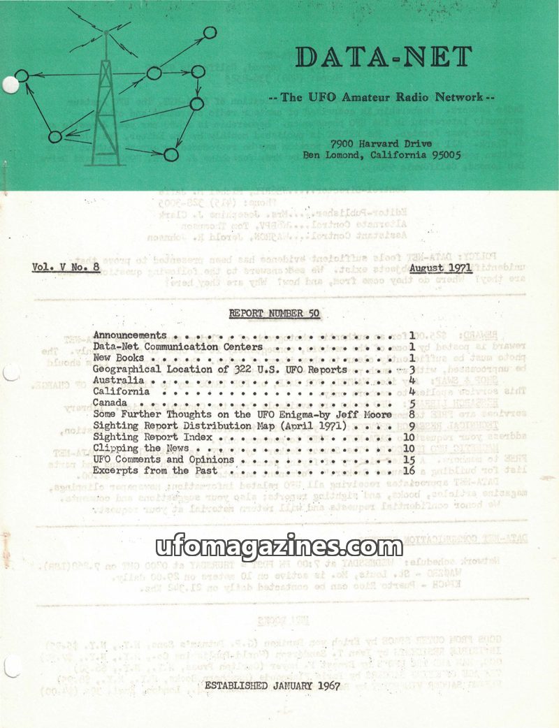 This issue of DATA-NET, published in February 1972, focuses on UFO sightings and investigations from August 1971. It includes a Sighting Report Index and Distribution Map, detailin