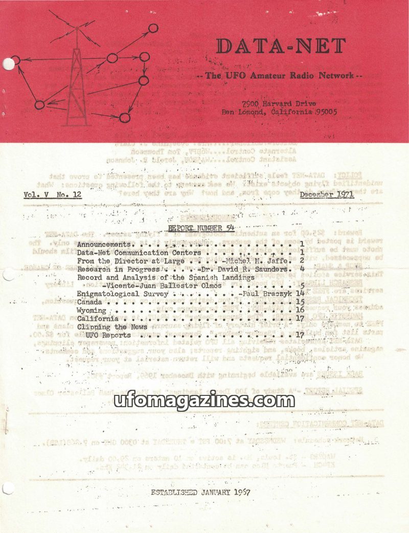 This issue of DATA-NET, dated December 1971, focuses on UFO research and data analysis. Dr. David R. Saunders details the development and growth of the UFOCAT database, which by it