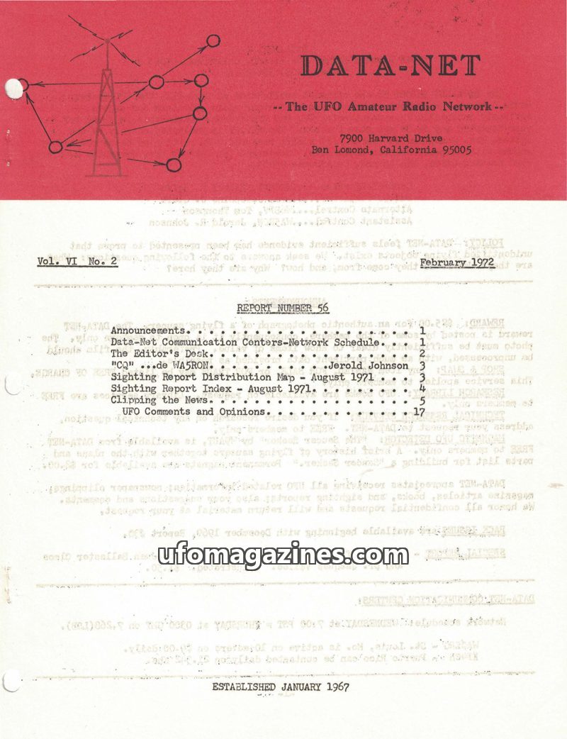 This issue of DATA-NET, the UFO Amateur Radio Network's publication, covers a range of UFO-related topics. It includes a sighting report map for December and January, detailing num