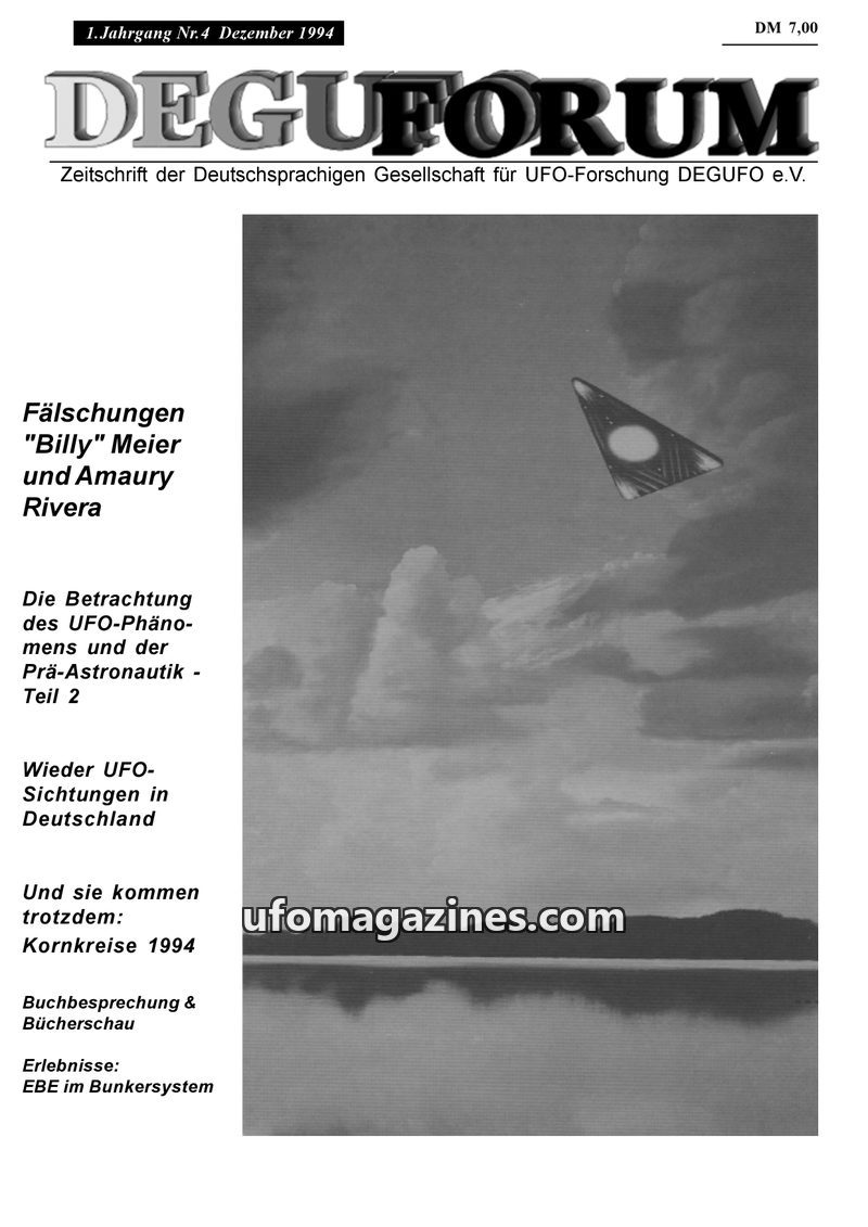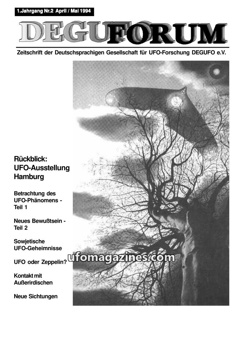 This inaugural issue of DEGUFORUM, dated January 1994, announces the official founding of the DEGUFO (German UFO Research Society) on June 5, 1993, in Frankfurt. It details the org