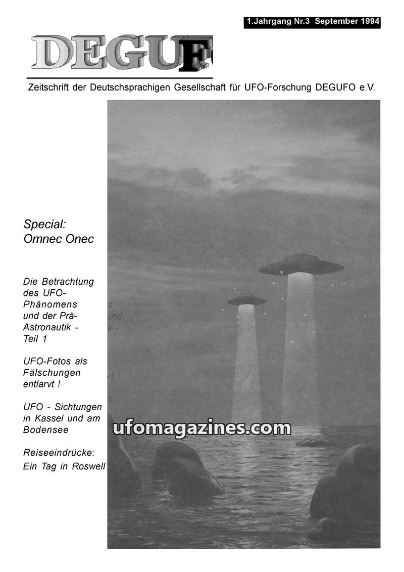 This issue of DEGUFO magazine, dated September 1994, features a special on Omnec Onec, who claims to be from Venus. It includes articles discussing the UFO phenomenon from psychoan