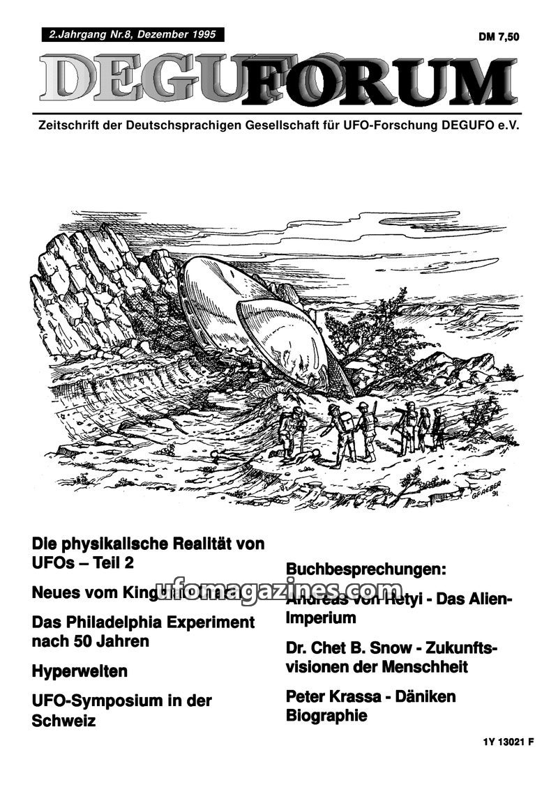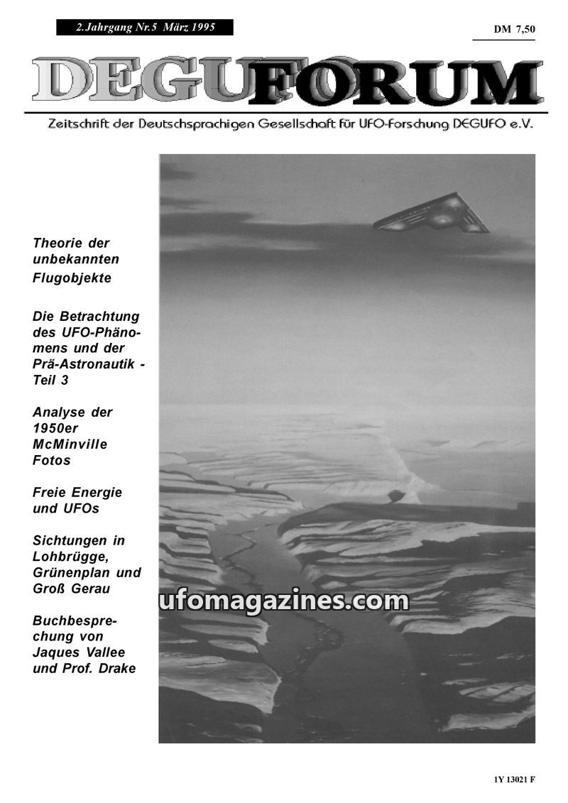 This issue of DEGUFORUM, dated March 1995, delves into the theory of unidentified flying objects and pre-astronautics, exploring psychoanalytical and parapsychological perspectives