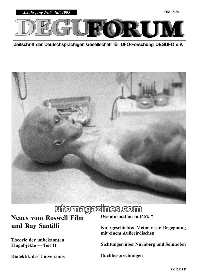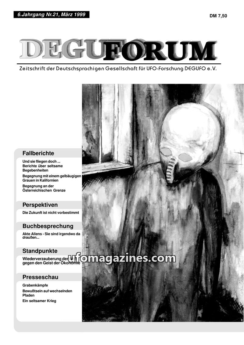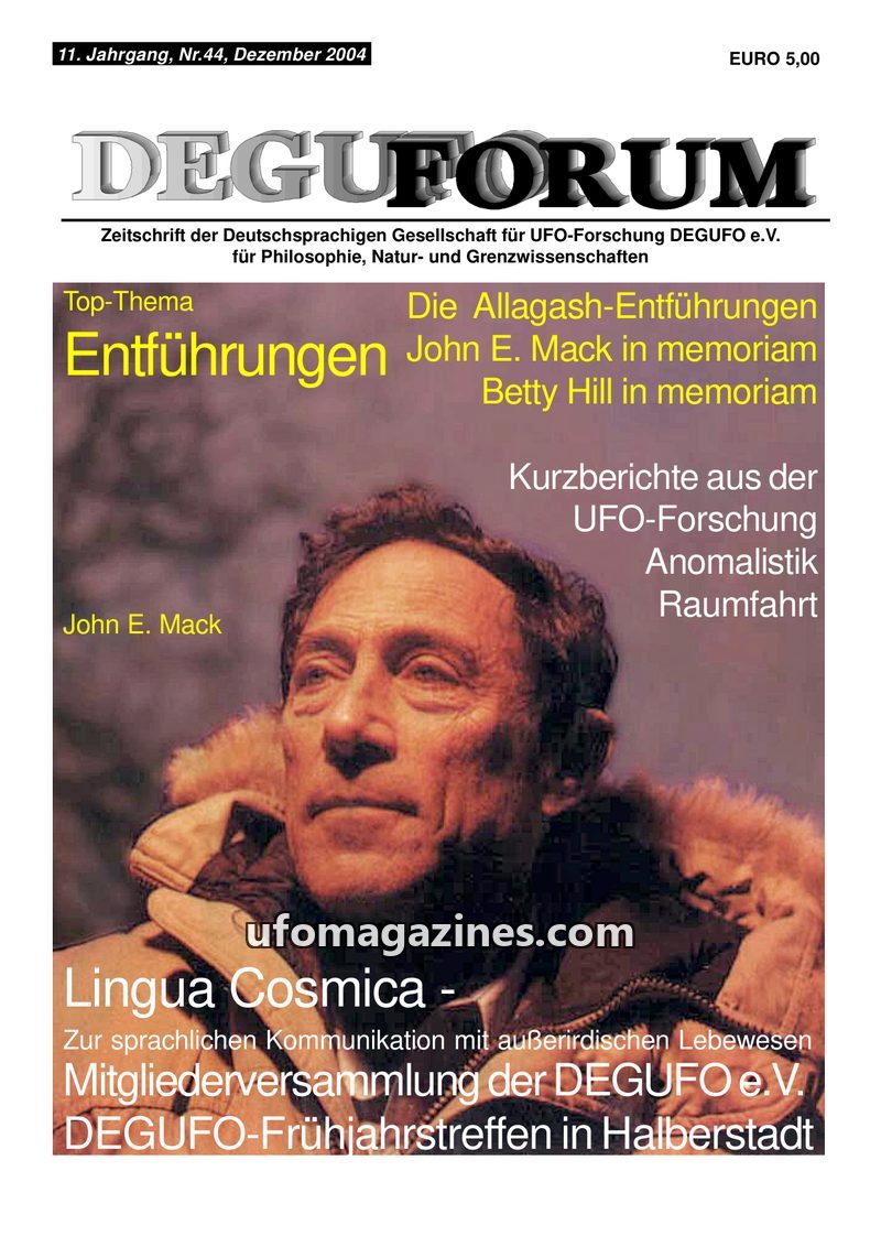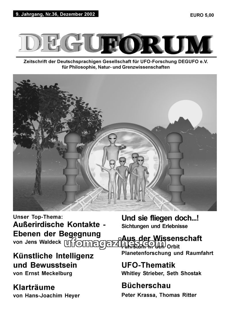 This issue of DEGUFORUM delves into the phenomenon of alien abductions, featuring a personal account of an encounter with 'Greys' in Germany and an analysis of the psychological an
