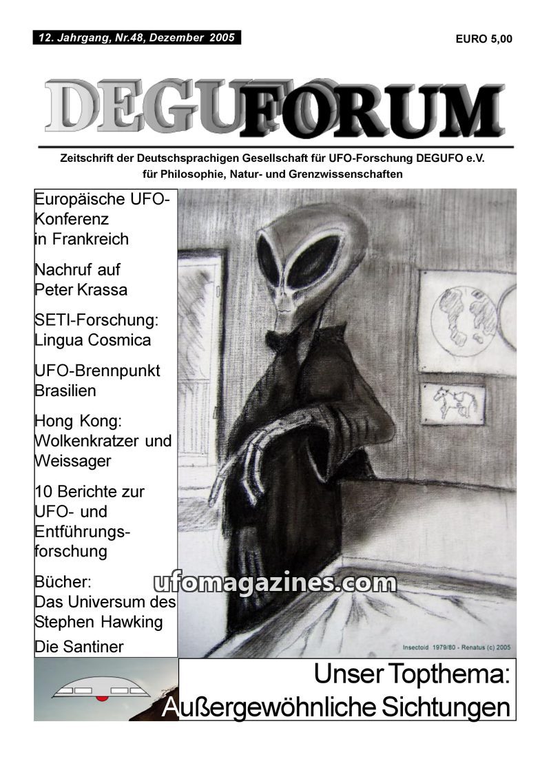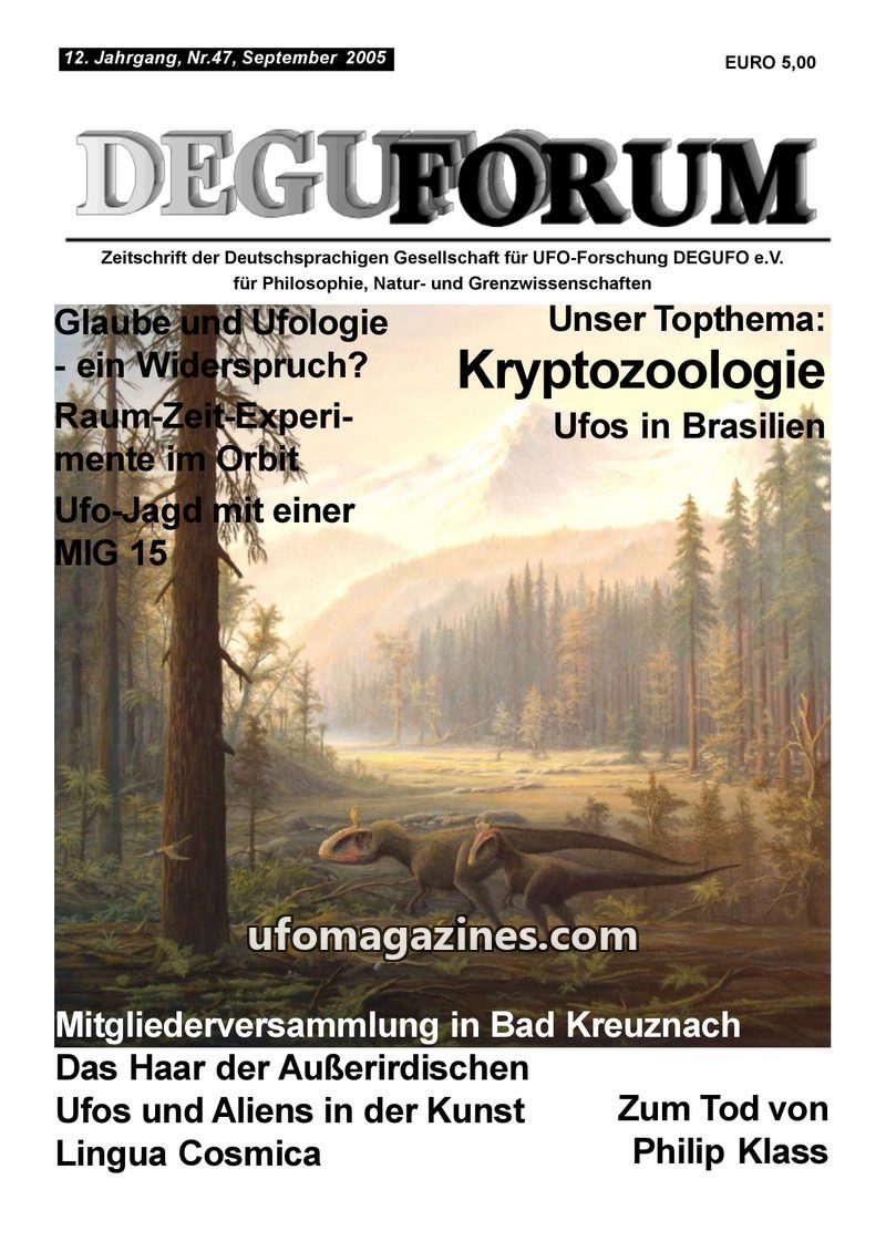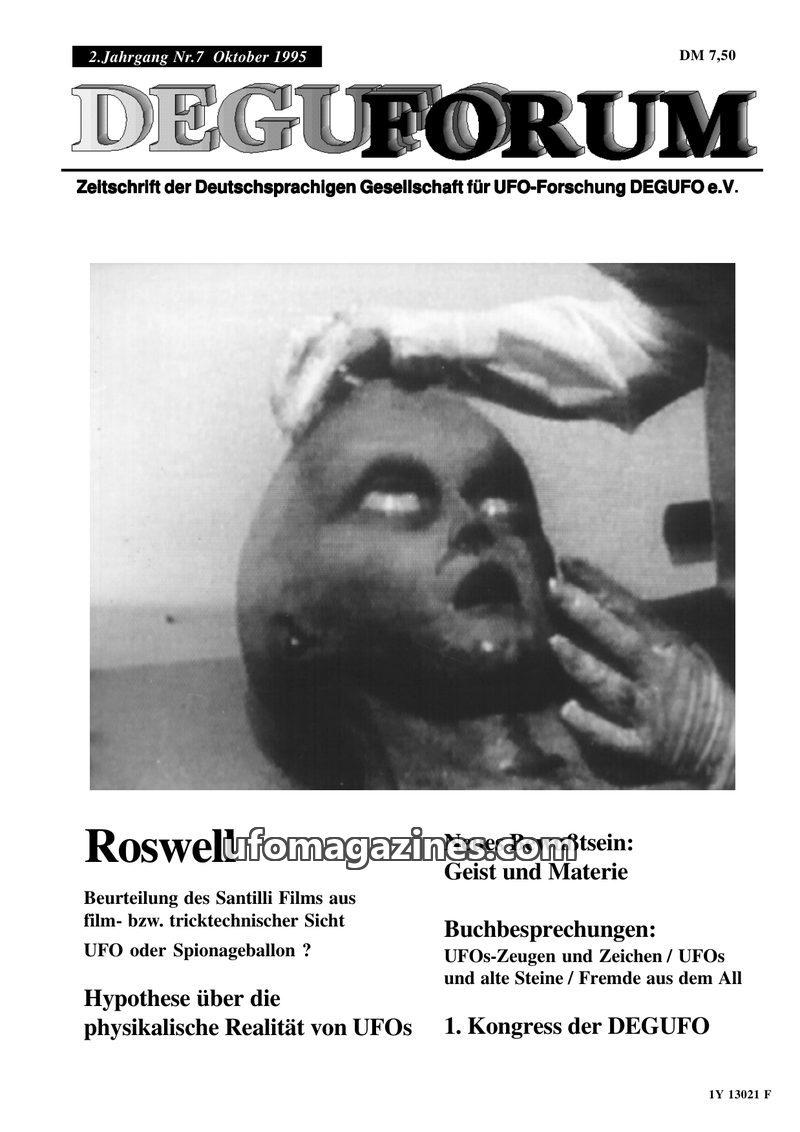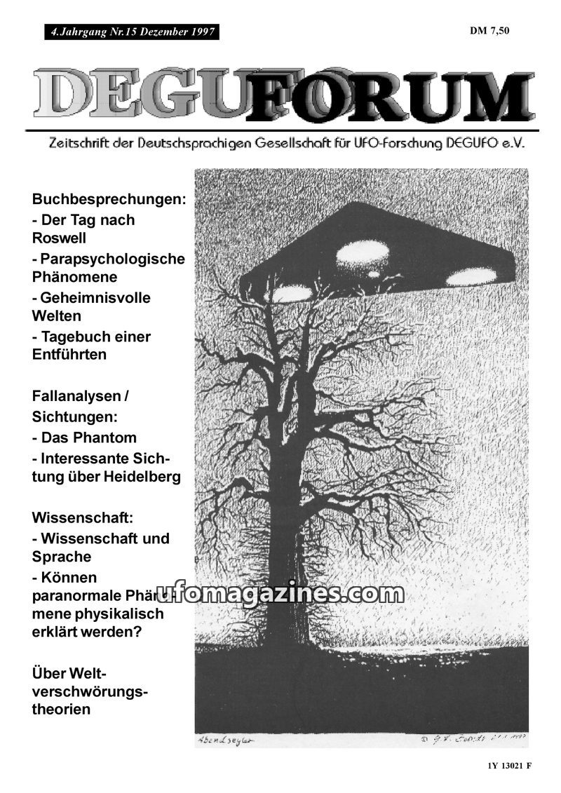 This issue of DEGUFORUM delves into the phenomenon of alien abductions, featuring a personal account of an encounter with 'Greys' in Germany and an analysis of the psychological an
