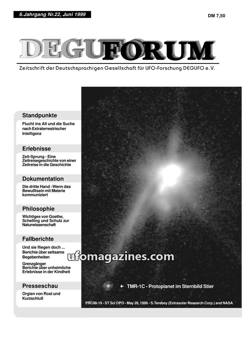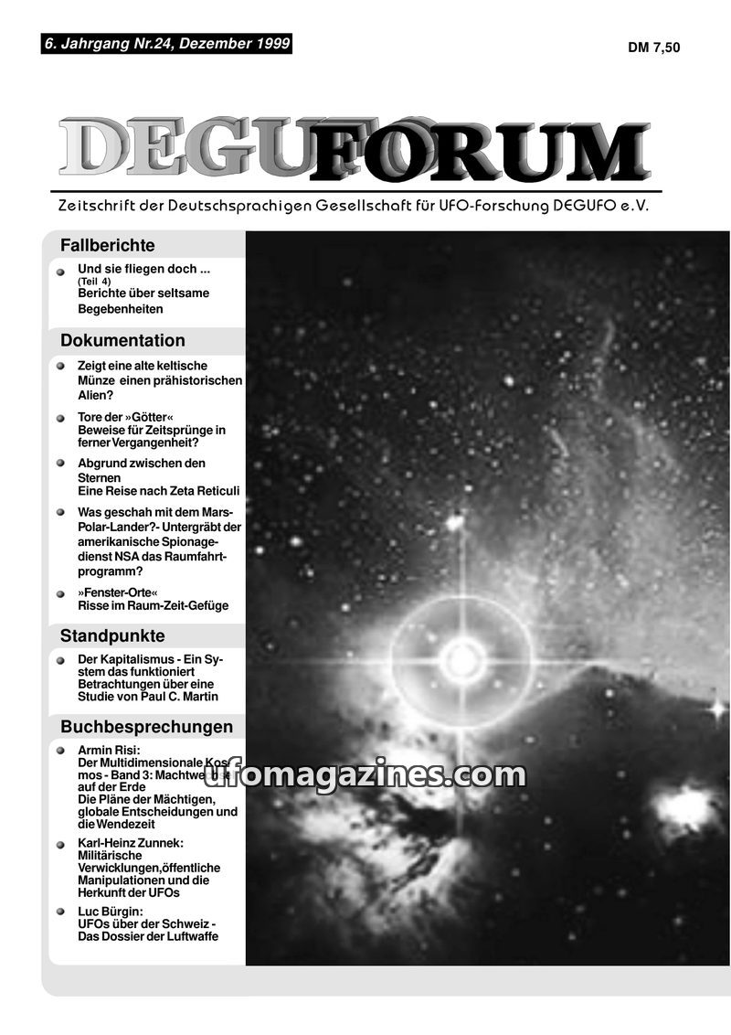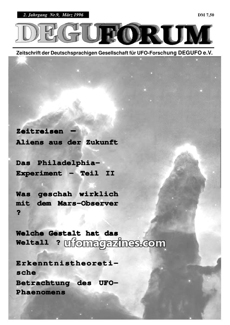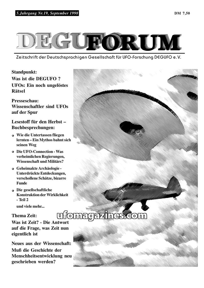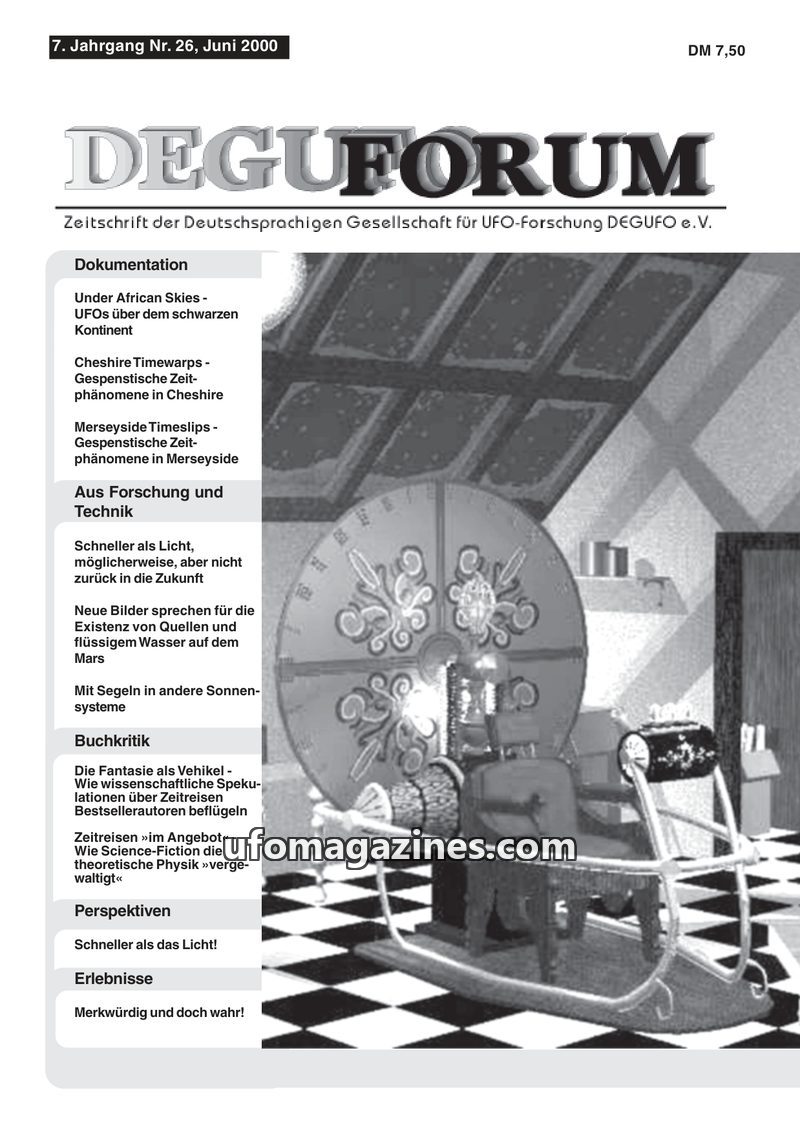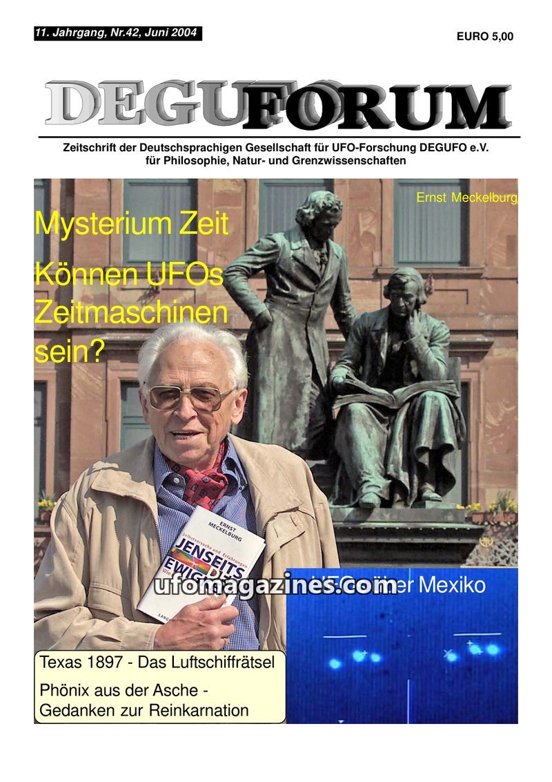 This issue of DEGUFORUM delves into the possibility of time travel and its connection to UFO phenomena, featuring an interview with author Ernst Meckelburg and an analysis of Steph
