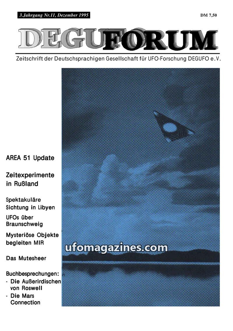 This issue of DEGUFORUM explores various UFO and anomaly-related topics. It features an update on Area 51, suggesting a focus on consciousness control rather than alien technology.