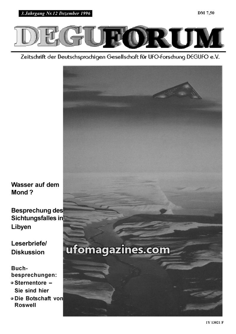This issue of DEGUFORUM, dated December 1996, explores various facets of UFO research and paranormal experiences. The cover story questions the presence of water on the Moon, refer