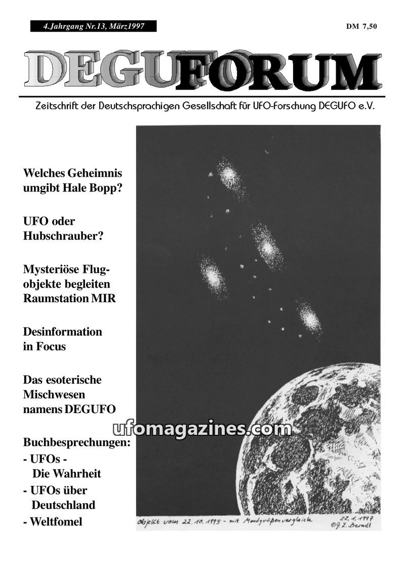 This issue of DEGUFORUM, dated March 1997, delves into various UFO-related topics. It features an in-depth look at Comet Hale-Bopp, including its unusual discovery and potential co