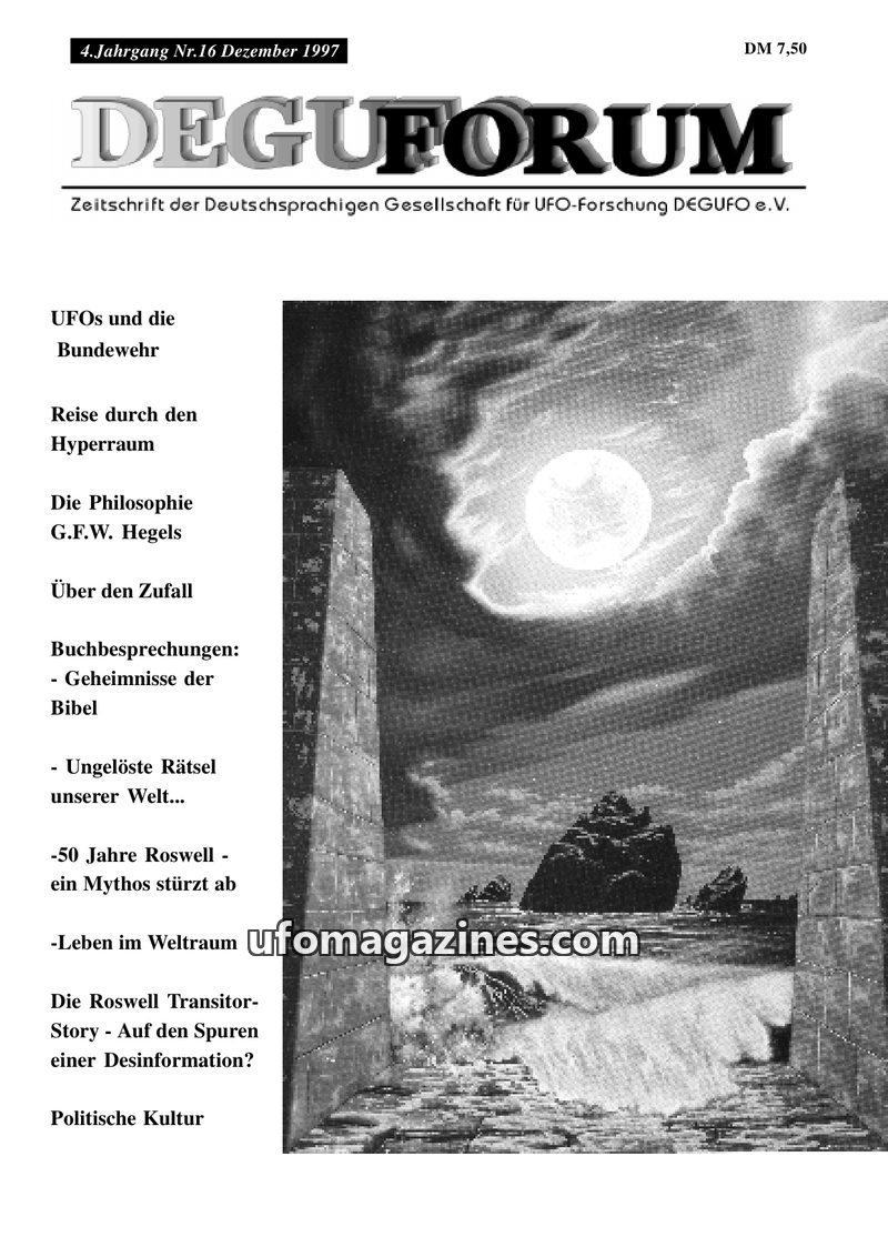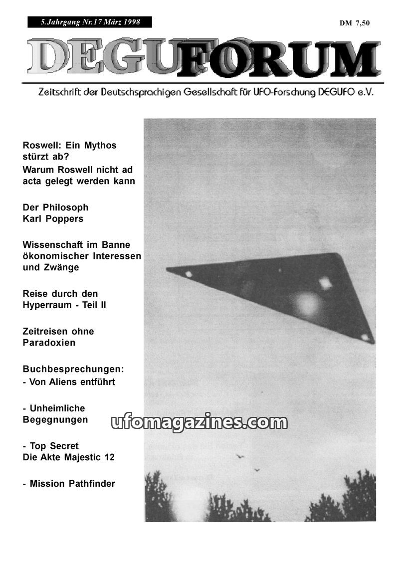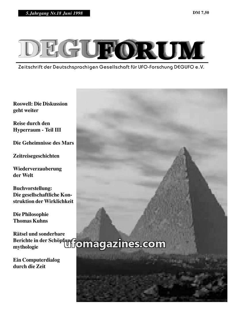 This issue of DEGUFORUM delves into the ongoing Roswell debate, with Uli Thieme critiquing Reinhard Nühlen's analysis of his Roswell documentation. Articles explore time travel the