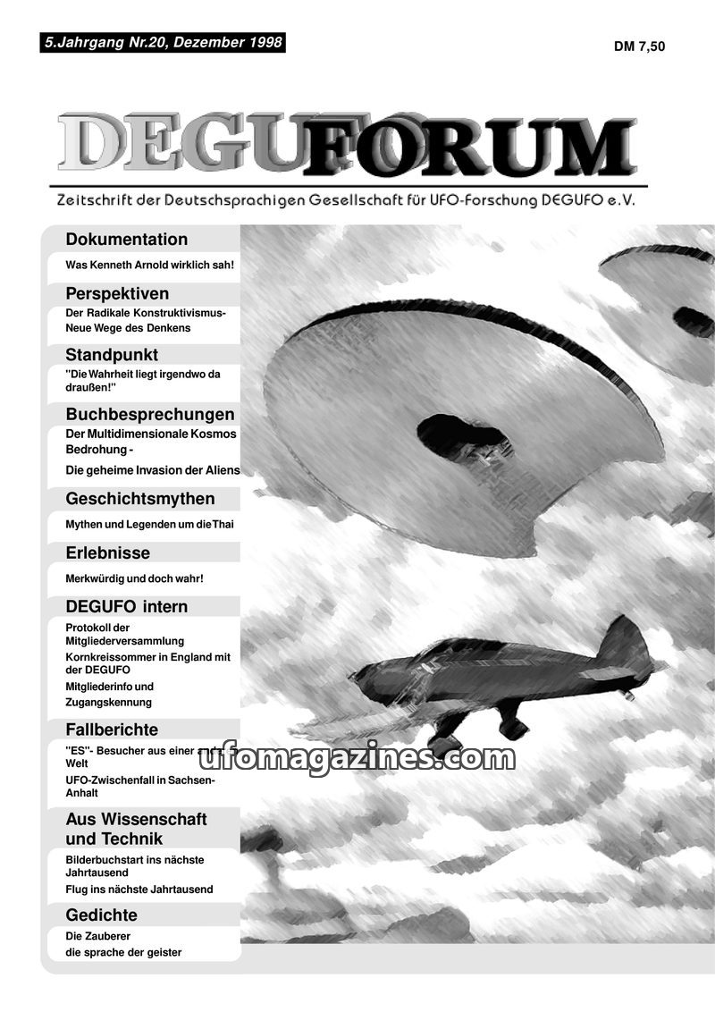 This issue of DEGUFORUM, dated December 1998, delves into the foundational Kenneth Arnold UFO sighting of 1947, re-examining what he truly saw in light of new findings. It explores