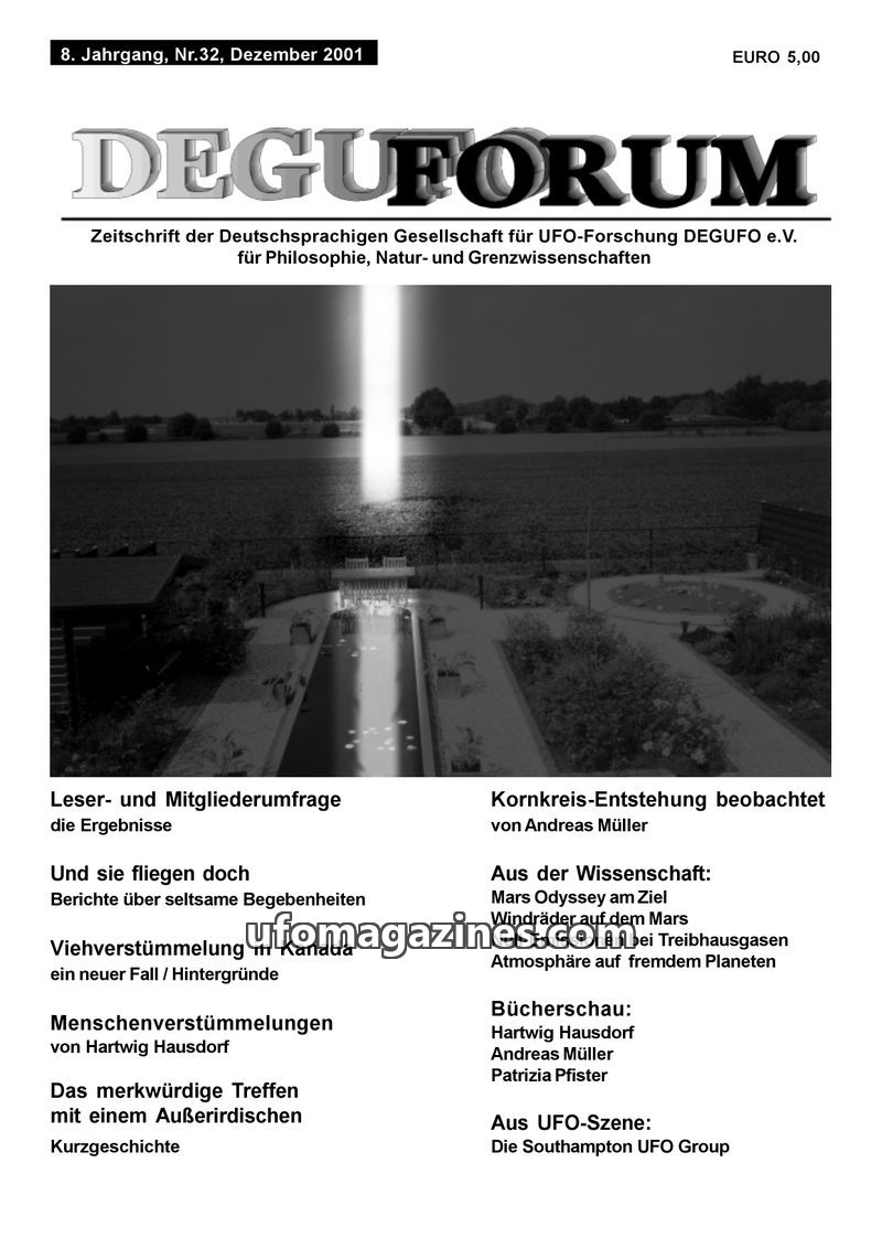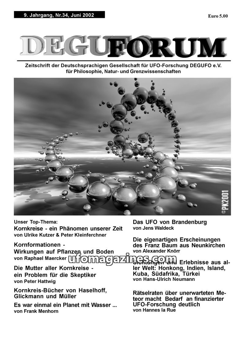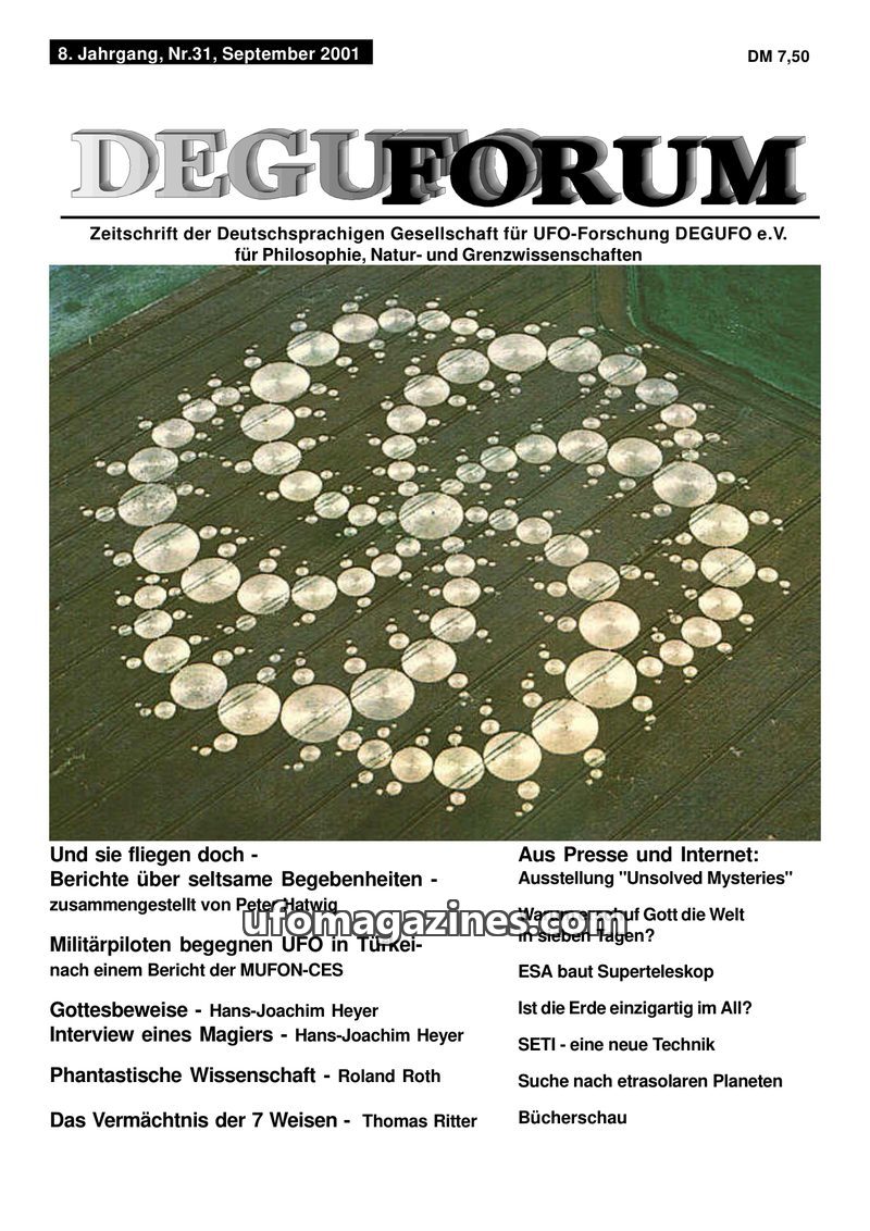 This issue of DEGUFORUM, dated September 2001, features a variety of articles on UFO phenomena, crop circles, and scientific and philosophical topics. It includes eyewitness accoun