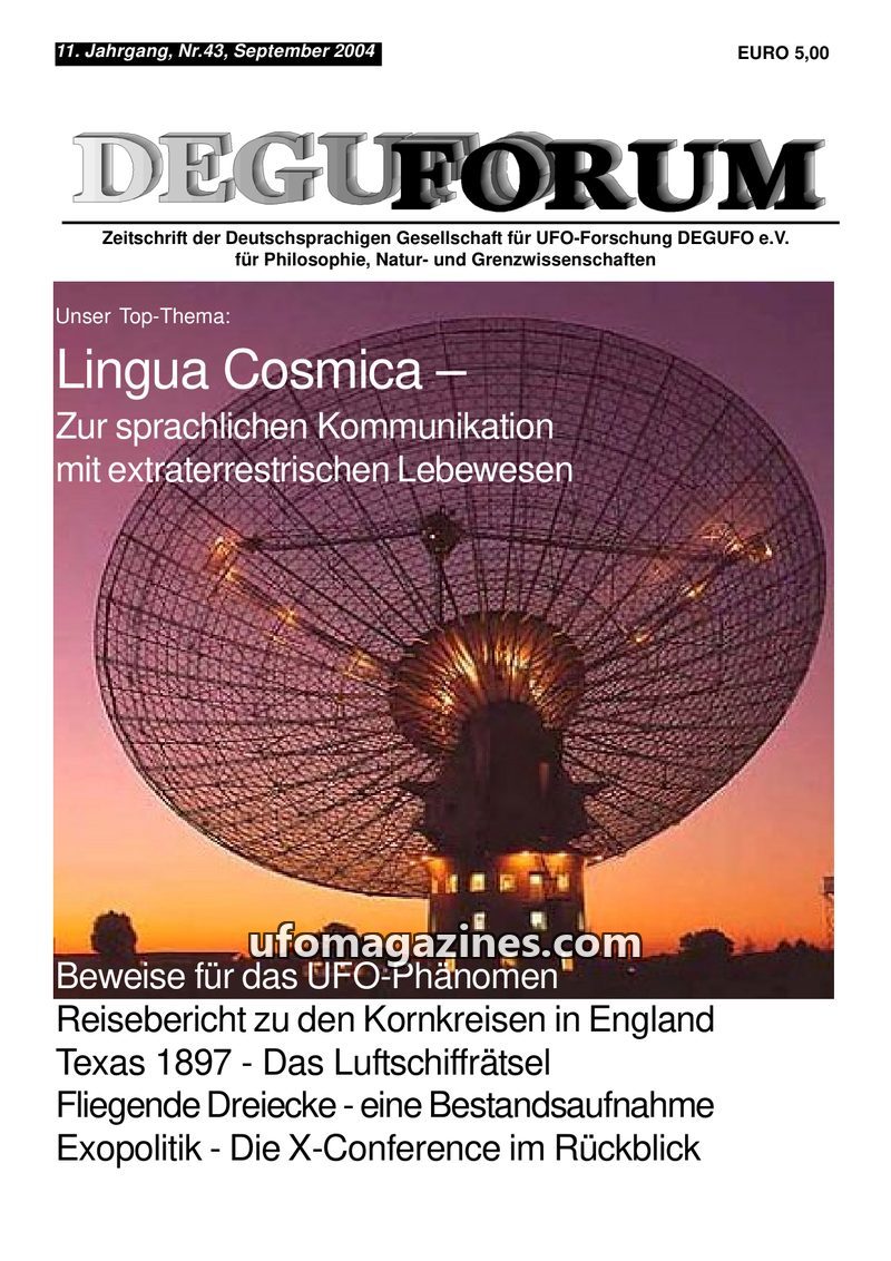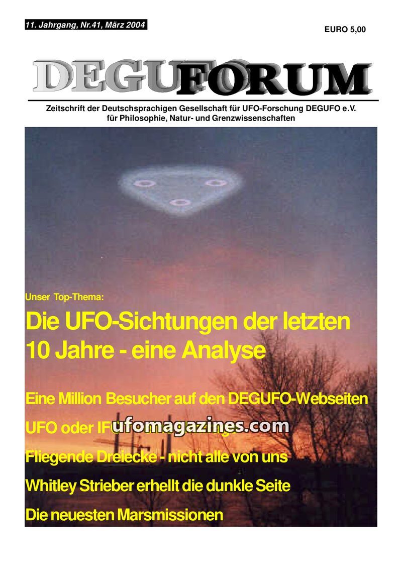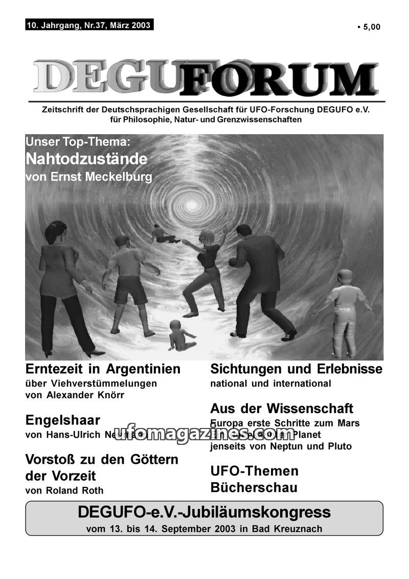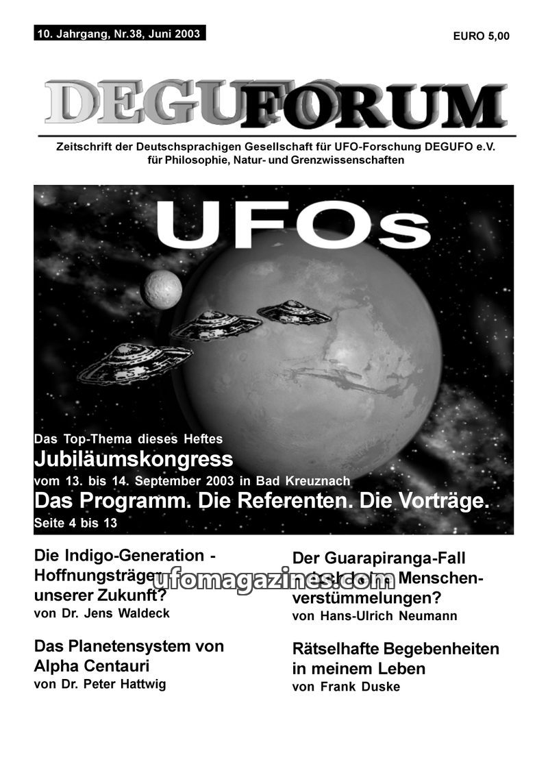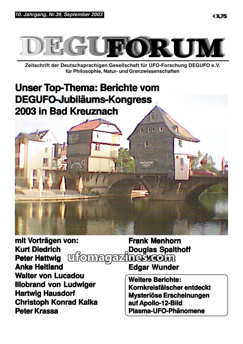 This issue of DEGUFORUM focuses on the 10th Anniversary Congress of the German UFO Research Society (DEGUFO e.V.) held in Bad Kreuznach on September 13-14, 2003. The magazine detai