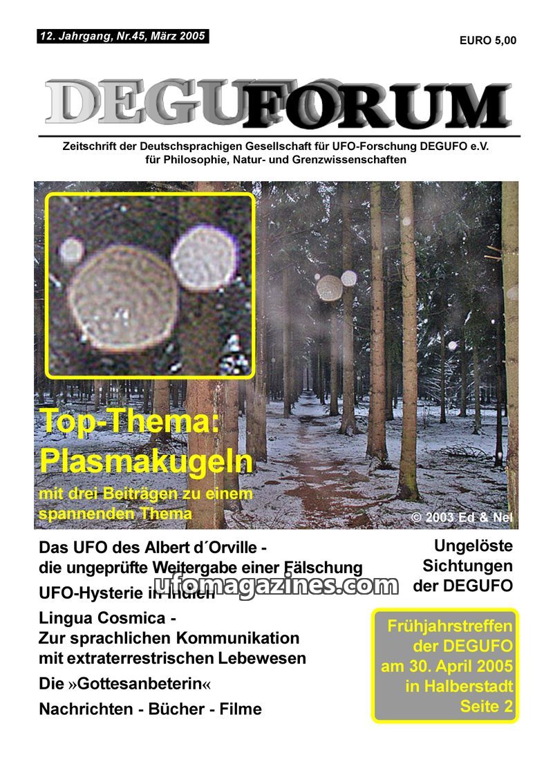 This issue of DEGUFORUM focuses on 'Plasma Spheres' (Orbs), exploring their nature, potential origins, and photographic evidence. It includes personal accounts of sightings, scient