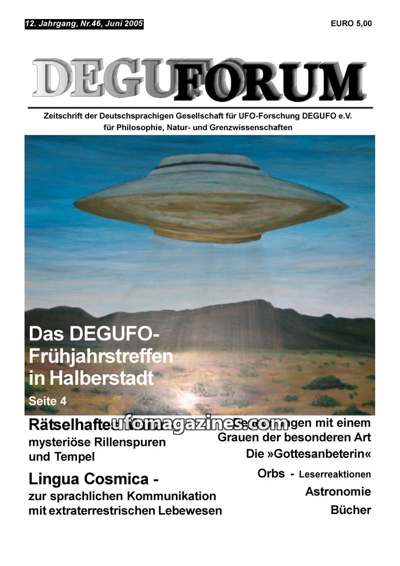This issue of DEGUFORUM covers the DEGUFO Spring Meeting in Halberstadt, featuring discussions on crop circles in England, the abduction phenomenon, and Lingua Cosmica. Articles ex
