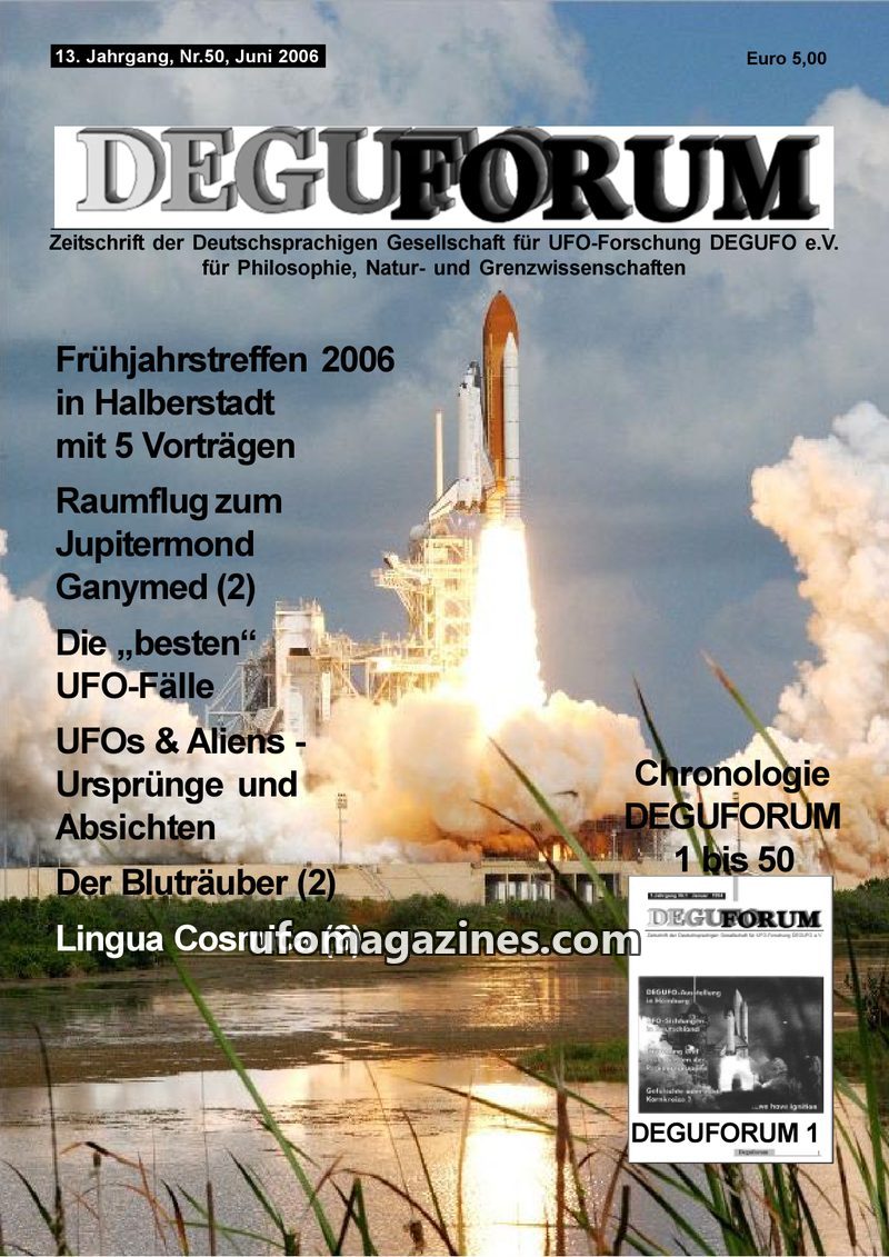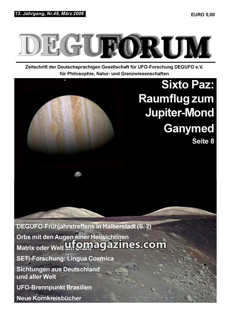 This issue of DEGUFORUM features a lead article on Sixto Paz's alleged space journey to Jupiter's moon Ganymed, detailing his experiences and communications with extraterrestrials.