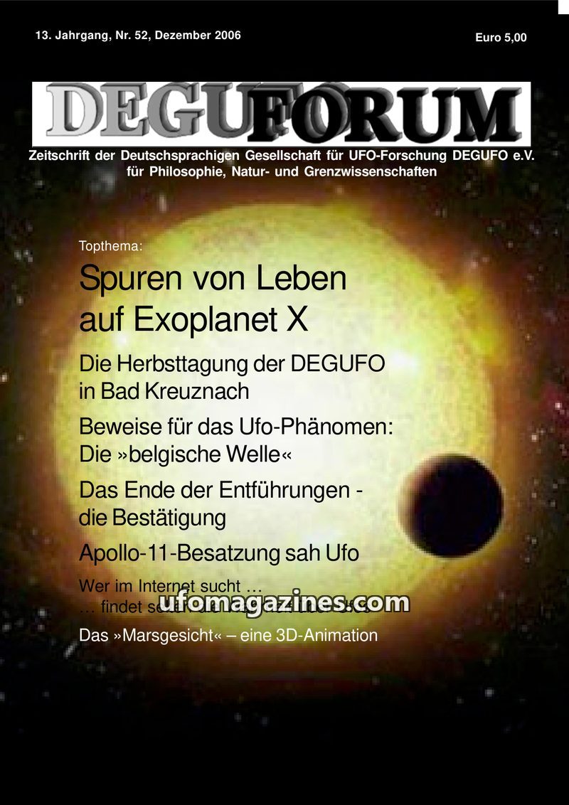 This issue of DEGUFORUM (December 2006) focuses on the search for extraterrestrial life, with a top theme on 'Traces of Life on Exoplanet X' by Dr. Jens Waldeck. It covers the DEGU