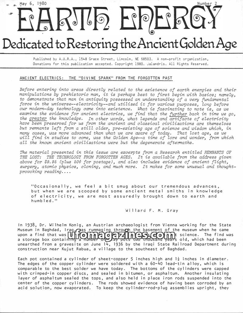 This issue of Earth Energy explores evidence of advanced electrical knowledge in ancient civilizations. It details the discovery of ancient batteries in Iraq, dating back to the Pa